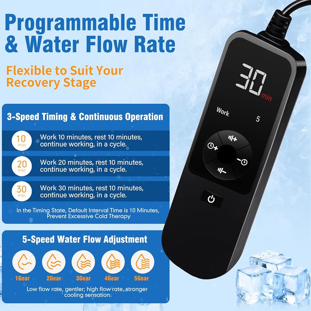 【Programmable Design】Choose what feels right for your recovery. Set 10, 20, or 30 minutes of cooling sessions, followed by a built-in 10-minute rest, then continued running—This ensures greater safety and effectiveness without overstimulation. With 5 adjustable flow levels, from light cooling to deeper cold therapy, based on how you feel that day.