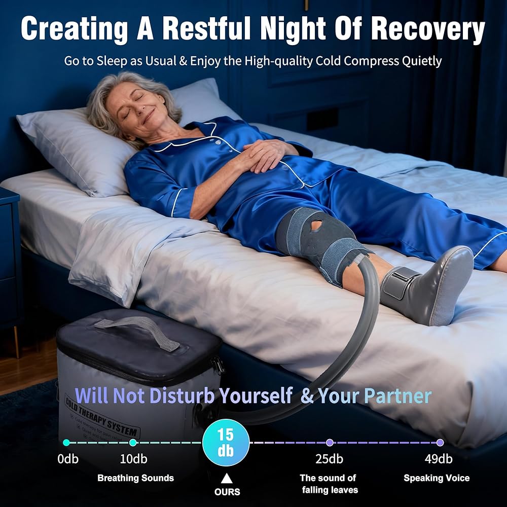 【Ultra-Quiet Operation】Quietness is paramount during recovery nights. Our high-quality brushless silent pump reduces operating noise to just 15dB—so soft you'll barely hear it. Simply close your eyes and feel the pain subside, while enjoying high-quality cold therapy the night.