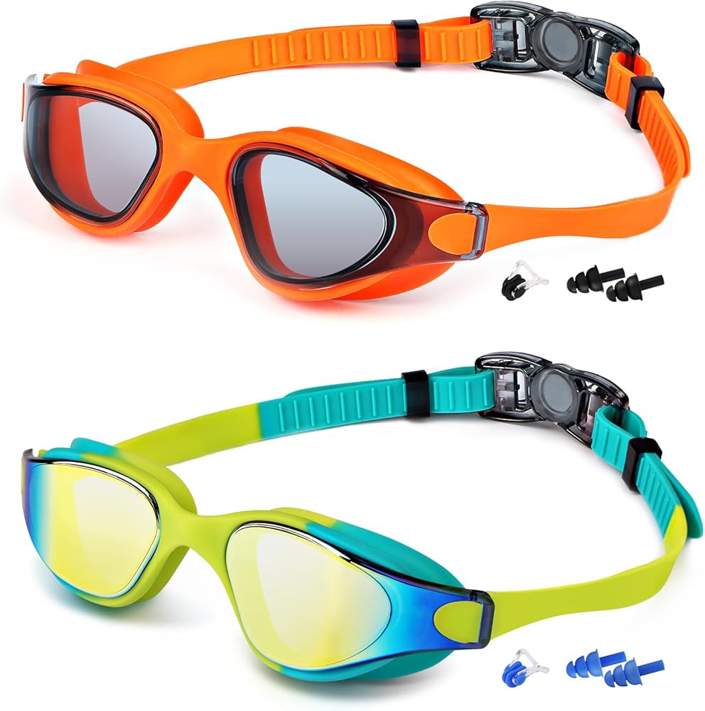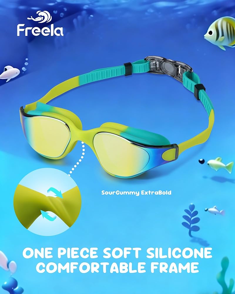 نظارات سباحة للأطفال من Freela مكونة من قطعتين من نظارات السباحة للأطفال من عمر 3-6 4-7 5-7 6-14 8-12 للأولاد والبنات والأطفال الصغار، نظارات سباحة قطعة واحدة 180 درجة رؤية واسعة وواضحة مضادة للضباب وحماية من الأشعة فوق البنفسجية، نظارات سباحة لشاطئ حمام