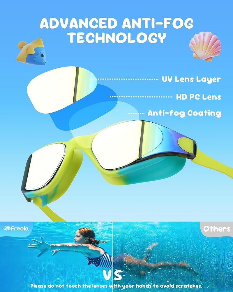 【تقنية شفافة كريستالية ومتقدمة مضادة للضباب】نظارات السباحة فريلا مصممة خصيصًا للسباحين الأطفال، تتميز هذه النظارات بطبقة متطورة مضادة للضباب تضمن رؤية واضحة تمامًا خلال ساعات طويلة من التدريب. سواء كنت تقفز في حمام سباحة بارد أو تسبح حولك، سيستمتع الأطفال بضوء أكثر نعومة ووضوح معزز تحت الماء، مما يسمح لهم بالتركيز على الاستمتاع بالمرح.