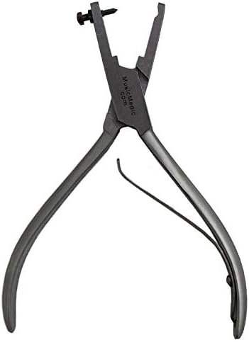Woodwind springs that are broken inside a post can be difficult to remove. Tapping out broken springs with a pointed punch can move the post. With these spring removing pliers, pressure is placed on both sides of the post to reduce the possibility of accidentally moving the post while removing the spring. One jaw is rounded to fit the post while the other jaw has a pointed screw to press the spring through the post. Extra screws are available Length: 5.5 in. or 140 mm