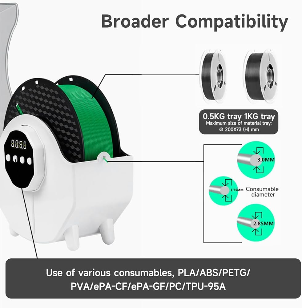 【نطاق توافق واسع】مجفف خيوط PLA متوافق مع معظم الشعيرات. تعمل خيوط الصندوق الجاف بشكل مثالي مع جميع الأقطار القياسية 1.75 مم/2.85 مم/3.00 مم.