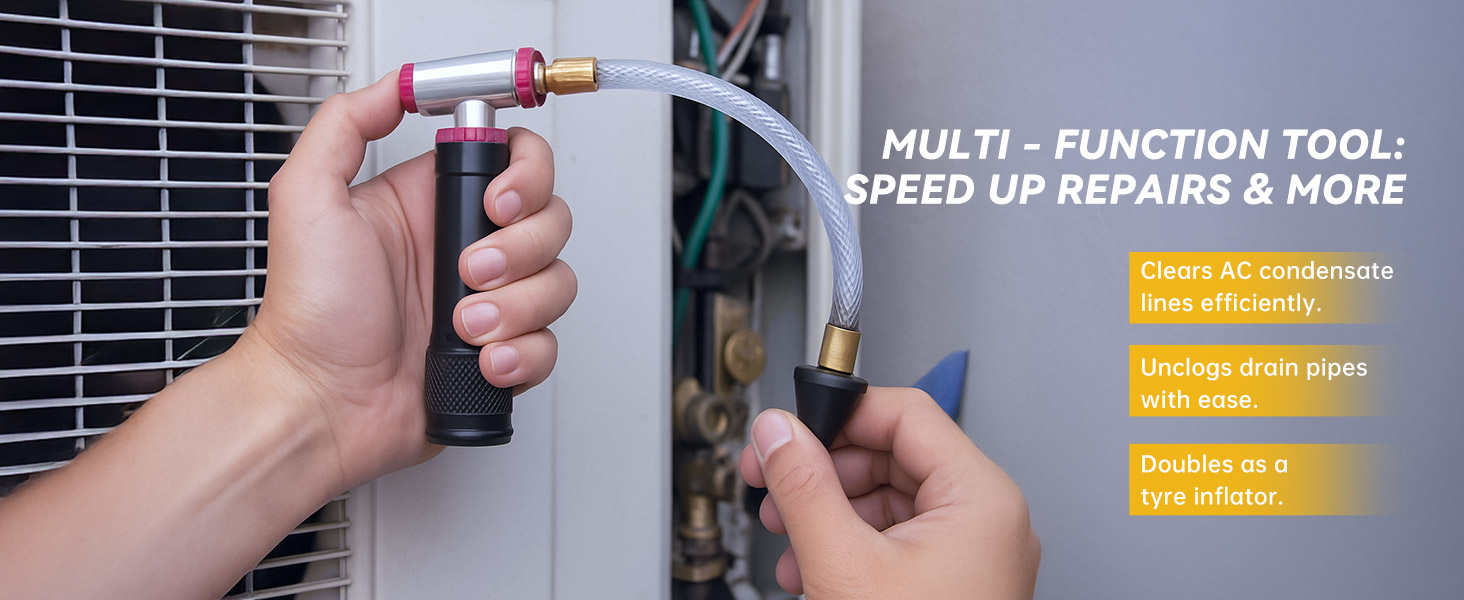 تصميم سهل الاستخدام - لا حاجة إلى إعداد معقد أو مهارات احترافية. التصميم خفيف الوزن يجعل من السهل التعامل معه وتخزينه، مما يجعله مثاليًا للصيانة المنتظمة لخطوط المكثفات AC وHVAC ومنظف خط تصريف التكييف.