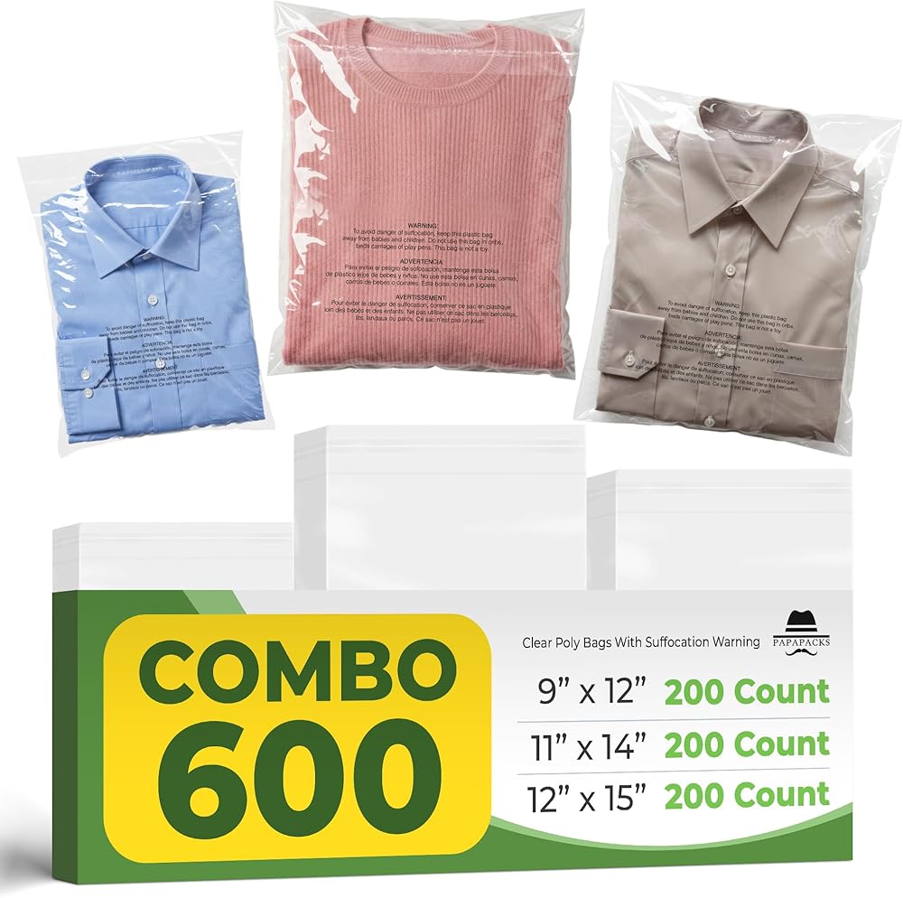 Papapacks 9"x12" (200 Pack) + 11"x14" (200 Pack) + 12"x15" (200 Pack) - Combo 600 Count heavy duty clear poly bags feature a printed suffocation warning in three languages, ensuring safe and compliant packaging. Designed for industrial and warehouse applications, these self seal bags protect items from dust and moisture while keeping them visible for easy identification. The secure adhesive strip provides a tamperevident seal, making them ideal for shipping, storage, and organizational needs in commercial and retail settings.