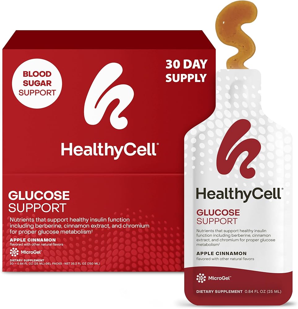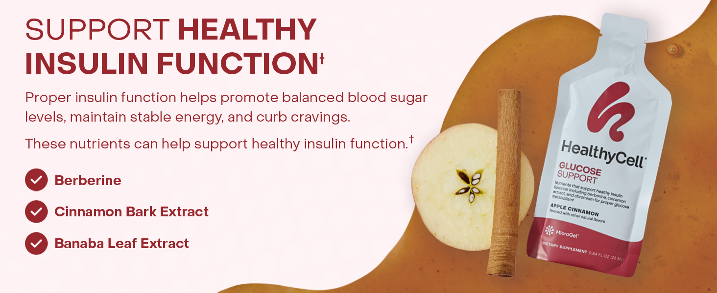 دعم كامل لتوازن السكر في الدم: دعم HealthyCell Glucose هو مكمل شامل لدعم الجلوكوز في MicroGel عالي الامتصاص. مزيج من المستخلصات النباتية والفيتامينات والمعادن التي تساعد على دعم التمثيل الغذائي السليم للجلوكوز ودعم وظيفة التمثيل الغذائي الصحي، كل ذلك في MicroGel اللذيذ بنكهة التفاح والقرفة.