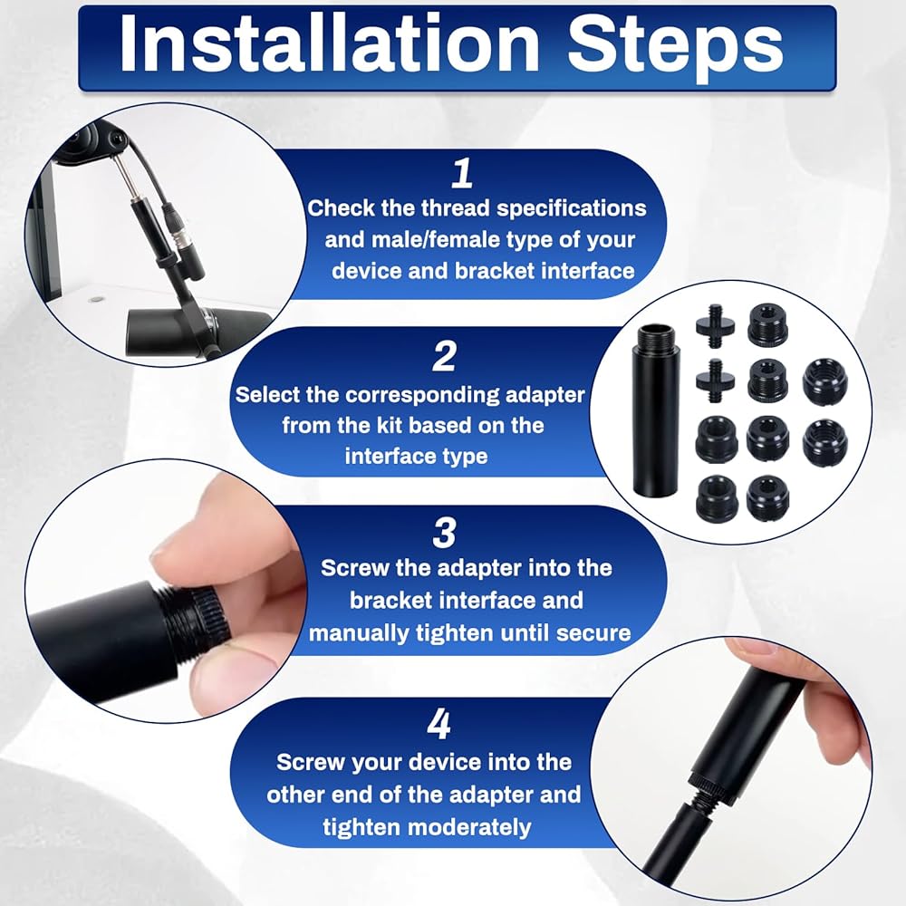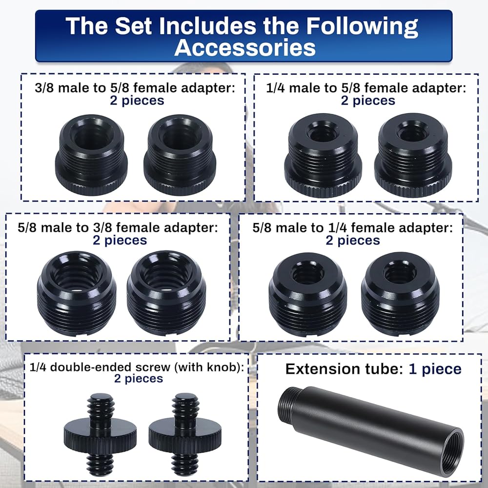 المجموعة الشاملة: تتضمن أربعة محولات مختلفة لتثبيت الميكروفون: محول أنثى 3/8 بوصة ذكر إلى 5/8 بوصة، ومحول أنثى 1/4 بوصة ذكر إلى 5/8 بوصة، ومحول أنثى 5/8 بوصة ذكر إلى 3/8 بوصة، ومحول أنثى 5/8 بوصة ذكر إلى 1/4 بوصة، ومسامير مزدوجة الأطراف مقاس 1/4 بوصة