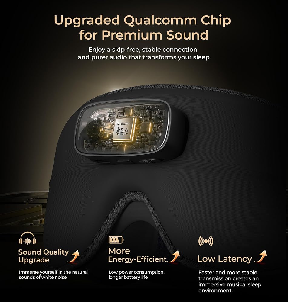 تجربة صوتية غامرة للنوم: مدعومًا بشريحة كوالكوم المطورة، تم تصميم قناع النوم البلوتوث الخاص بنا لتحقيق التميز الصوتي. استمتع باتصال قوي وخالي من التخطي يوفر صوتًا نقيًا ومستقرًا وغامرًا بشكل استثنائي. تخلق هذه التقنية المتقدمة بيئة صوتية مثالية للنوم، مما يساعدك على الاسترخاء بشكل أسرع، ومنع التشتيت، والحصول على راحة أعمق وأكثر متواصلة ليلة بعد ليلة.