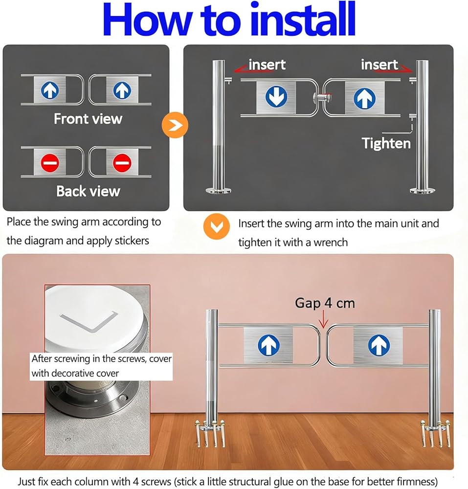 4,Durable Construction: Made from high-quality Stainless Steel, this heavy-duty Supermarket Swing Gate features excellent Waterproof and Wear-Resistant properties. Its Industrial-Grade design ensures smooth operation with low maintenance, making this Automatic Swing Gate ideal for Indoor and Outdoor environments where durability and cleanliness are essential for optimal performance.