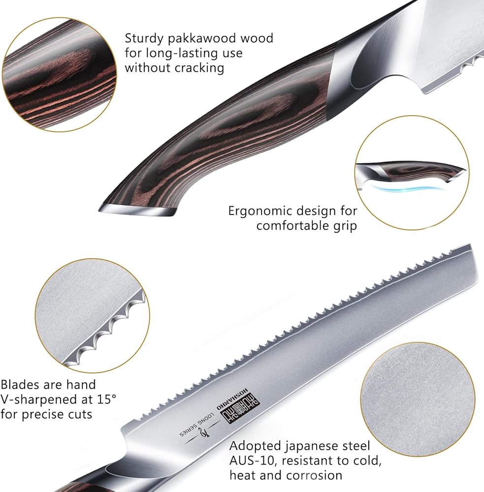 • 【فولاذ ياباني فائق】مصنوع من الفولاذ المقاوم للصدأ الياباني عالي الكربون 10Cr15CoMoV ومعالج بالحرارة بالفراغ في درجات حرارة عالية لمتانة استثنائية وتحسين الأداء المضاد للتآكل، مما يضمن الدقة والنعومة عند قطع الخبز.