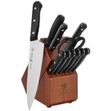 The Solution 12-piece block set features a distinctive set of high-quality knives, to set your kitchen up right. The set includes the all-rounder 8-inch chef's knife for chopping onions and cutting meat, the 4-inch paring knife, ideal for peeling vegetables, and the 5-inch serrated utility knife, handy for cutting soft interior, hard exterior foods. This set is completed with kitchen shears and a sharpening steel, all stored in a handsome hardwood block that features 6 steak knives. Fabricated from durable, high-quality stainless steel, Solution's single-piece, stamped blade construction is lighter than forged knives. Along with the full tang, this encourages maximum maneuverability. The ergonomic, traditional triple-rivet knife handles are curved for comfort and balance for fatigue-free cutting.