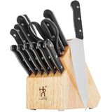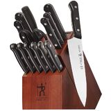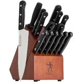 SET INCLUDES: 4-inch paring knife, 5-inch serrated utility knife, 8-inch chef's knife, Six 4.5-inch steak knives, kitchen shears, 9-inch sharpening steel, and 11 slot hardwood knife block