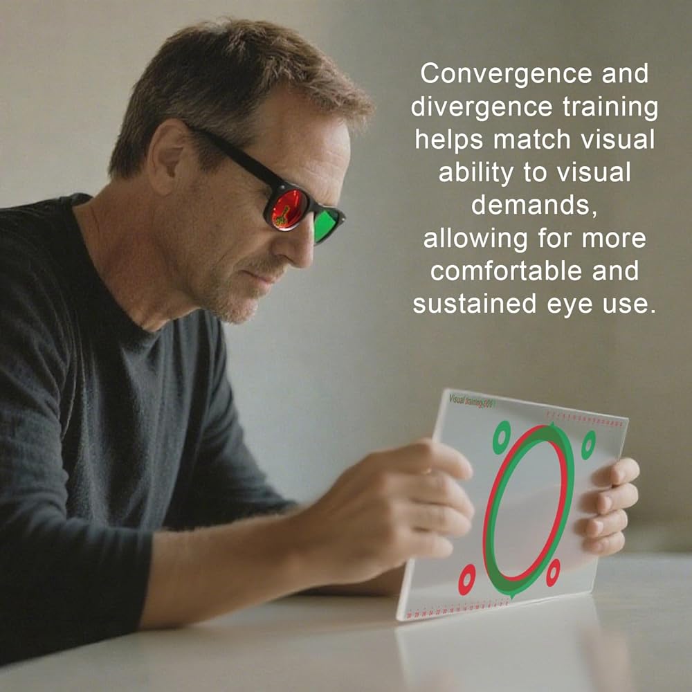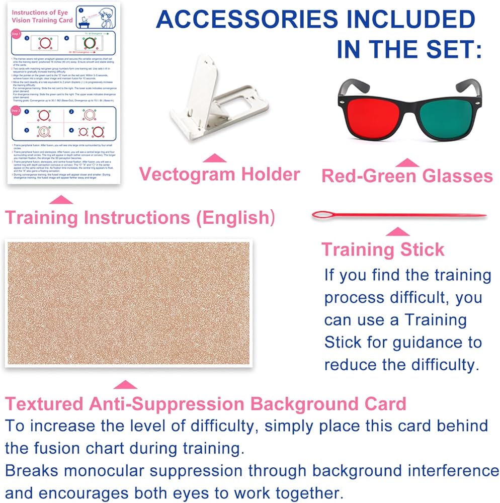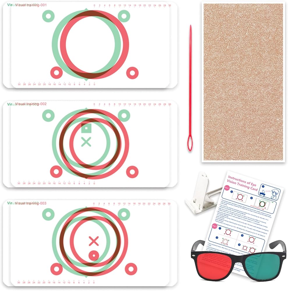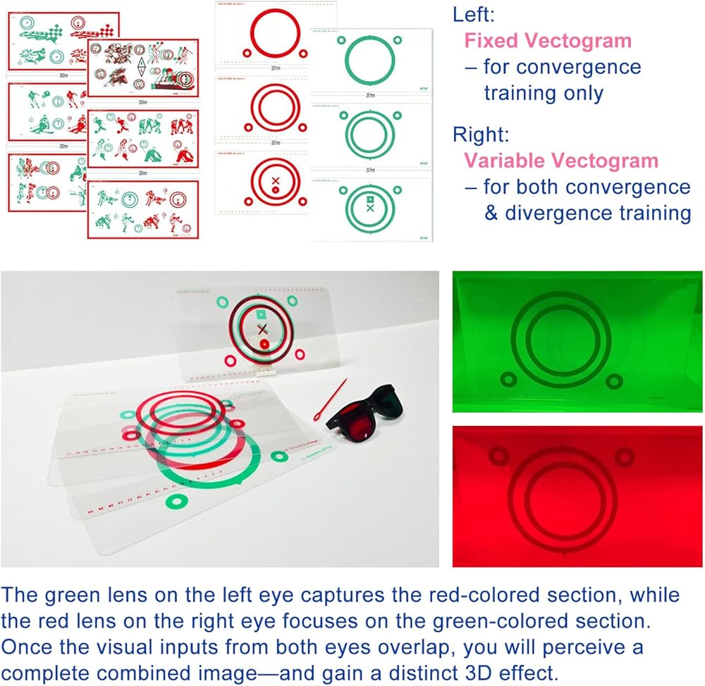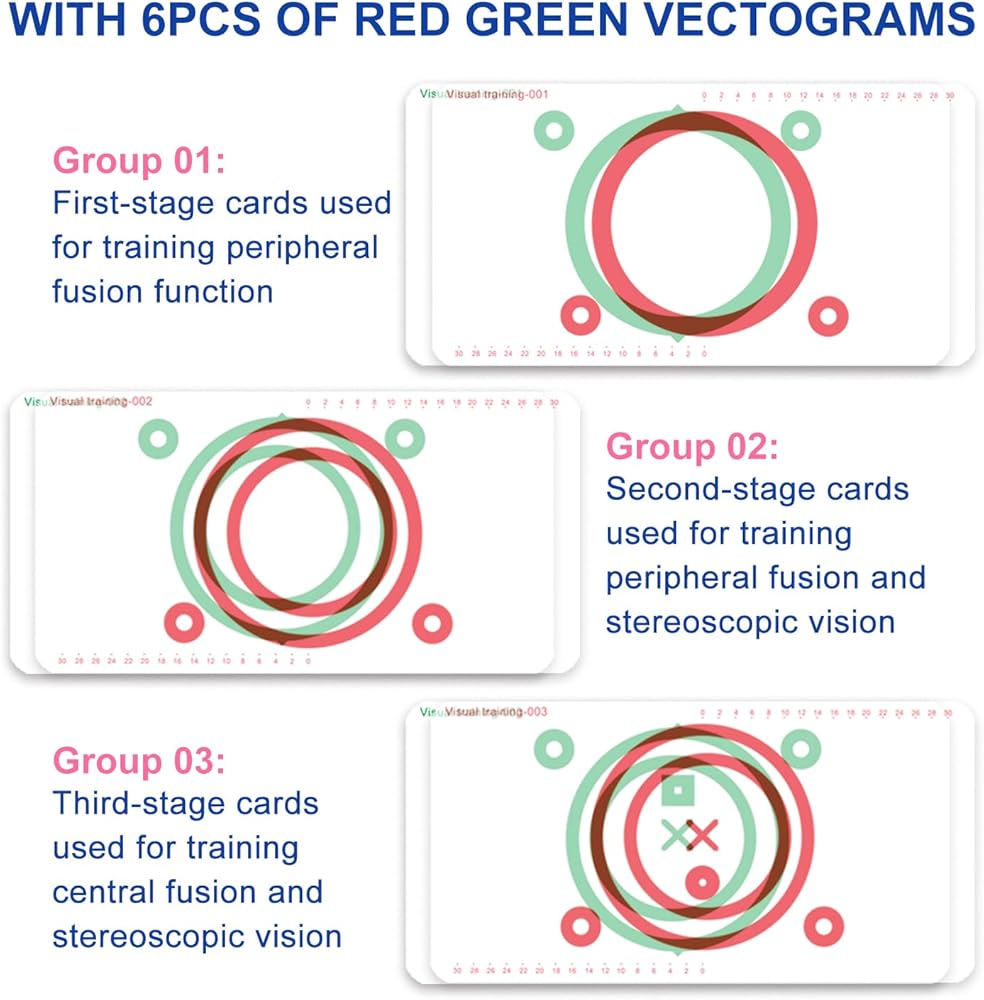 مجموعة التقارب والتباعد للتدريب على الرؤية - 6 بطاقات اندماج متغيرة باللون الأحمر والأخضر مع نظارات حمراء خضراء ومؤشر وحامل - تمرين مجهر وممارسة التجسيم للاستخدام المنزلي