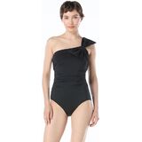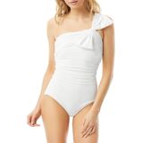 Inspired by Carmen Marc Valvo's iconic gowns known for their bold bows, this one piece swimsuit will have you feeling like a movie star on the beach. Featuring a bow shoulder and ruching, get ready to feel glam and gorgeous.