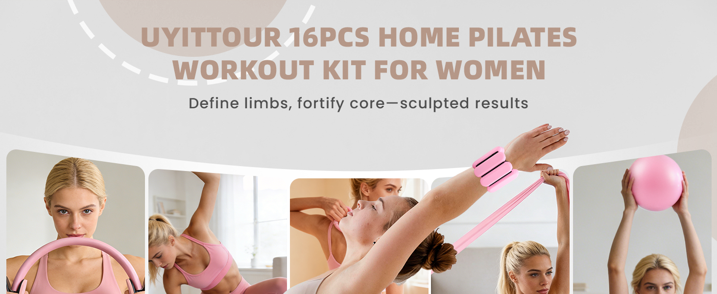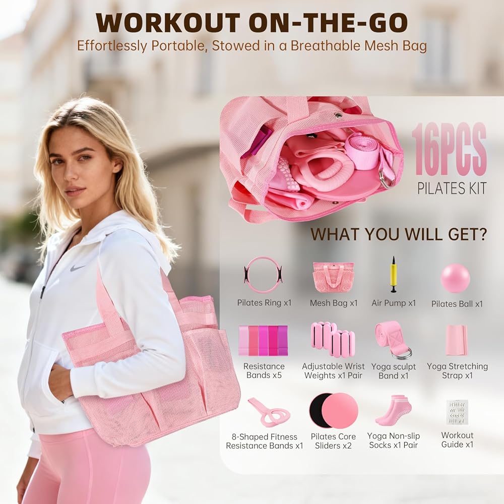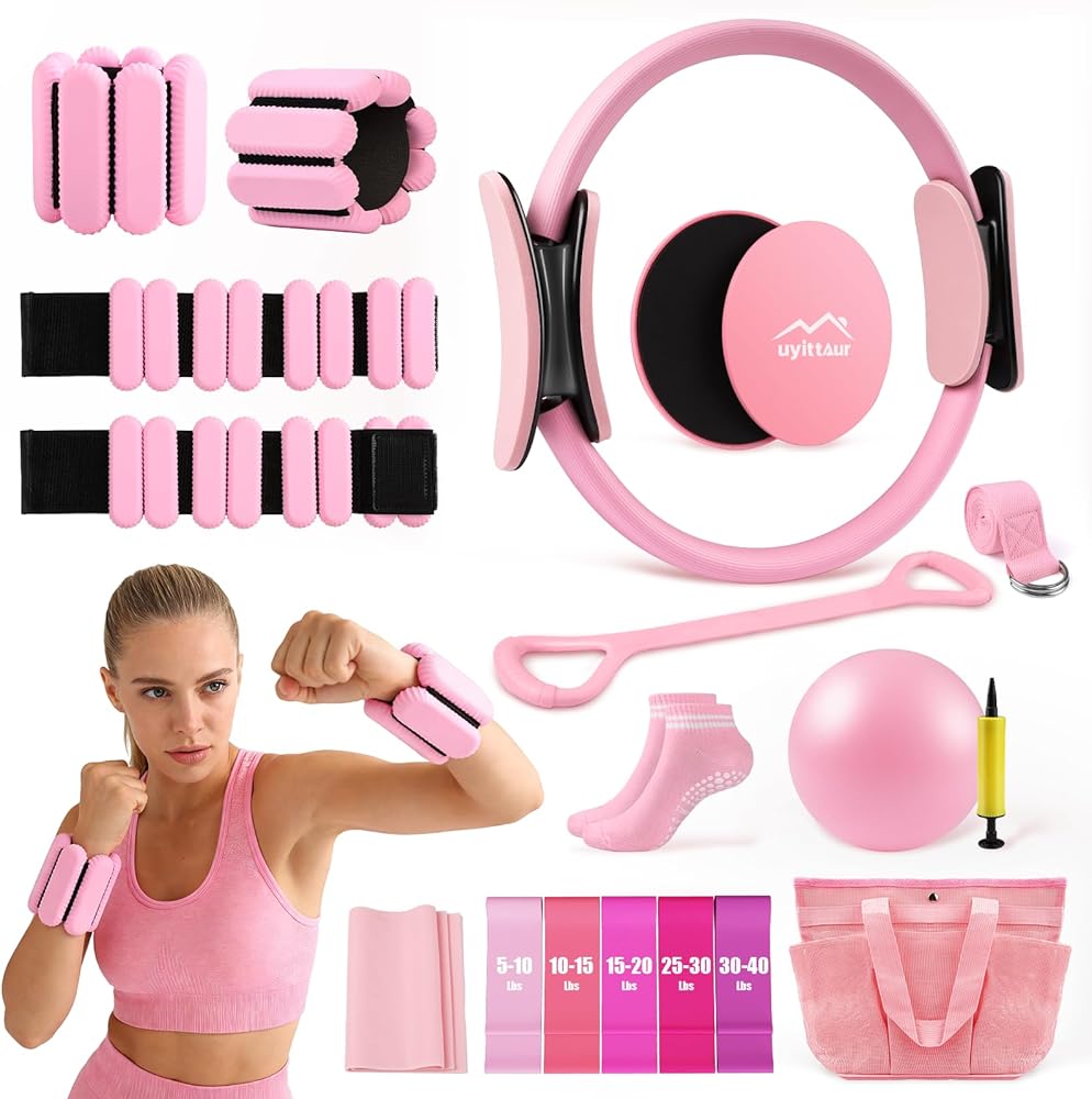 طقم بيلاتيس 16 قطعة من Uyittour، طقم تمارين بيلاتيس منزلي مع أوزان للكاحل، حلقة بيلاتيس ومجموعة كرة للنساء، معدات بيلاتيس مع أشرطة مقاومة، مزلقات أساسية وجوارب لبدء التدريبات المنزلية
