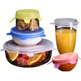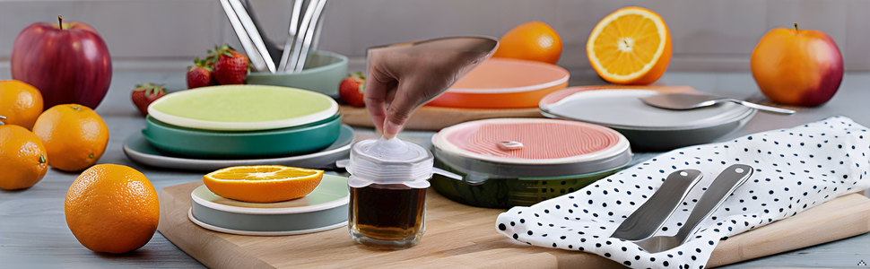 - أحجام متعددة: تتضمن المجموعة 6 أغطية سيليكون قابلة للتمدد بأحجام مختلفة لتناسب الحاويات المختلفة وقطع الفاكهة، بقطر يتراوح من 2.5 إلى 8 بوصات
