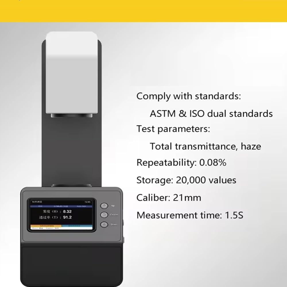 • 1. تكرار الضباب: قيمة الضباب <10%، التكرار ≥0.05%؛ قيمة الضباب ≥10%، التكرار ≥0.1%، تلبية معايير الاختبار التالية: معيار GB/T 2410، معيار ASTM D 1003، معيار ISO 13468، معيار ISO 14782 2. تلبية قياس الضباب والنفاذية الكاملة تحت ثلاثة مصادر إضاءة قياسية: CIE-A، CIE-C وCIE-D65