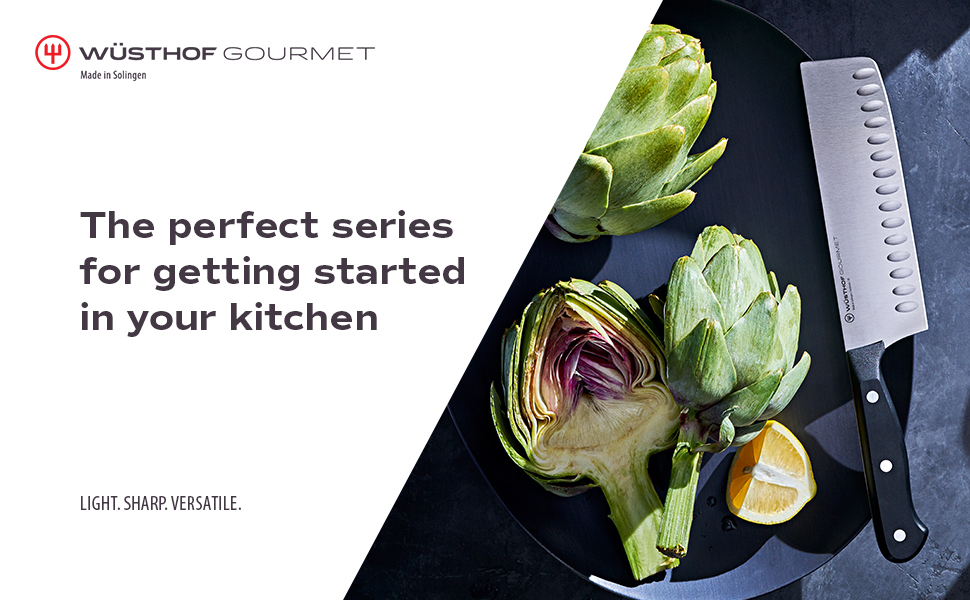 WÜSTHOF GOURMET SERIES – 5" Santoku Knife with synthetic polypropylene handles that resist fading, discoloration, heat and impact. Precisely laser-cut stamped knives offer superb quality and value