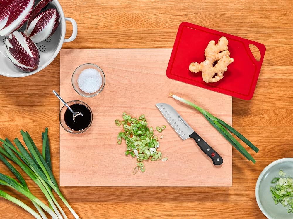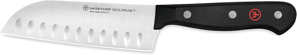 WÜSTHOF SANTOKU KNIFE – The GOURMET 5" Hollow Edge Santoku Knife is designed with a thinner blade than the traditional chef's knife, at a 10 cutting edge, and gradually curves up at the very end providing a straighter edge. The hollow edge is crafted with evenly spaced vertical indentations, which create small air pockets between the blade and the food that gently pushes food off the blade