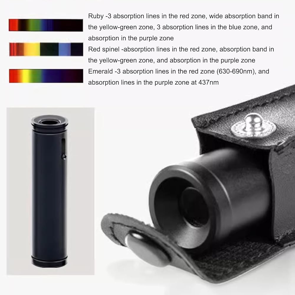 This portable spectroscope is expertly designed for comfortable hand-held use, making it easy to carry and use in any setting. Its metal shell ensures durability, while the prism optical type guarantees clear and precise results. The eyepiece features telescopic zoom for enhanced viewing. The sleek black color adds a modern touch to its design. Product dimensions are 75X18 mm. Included in the package is one spectroscope.