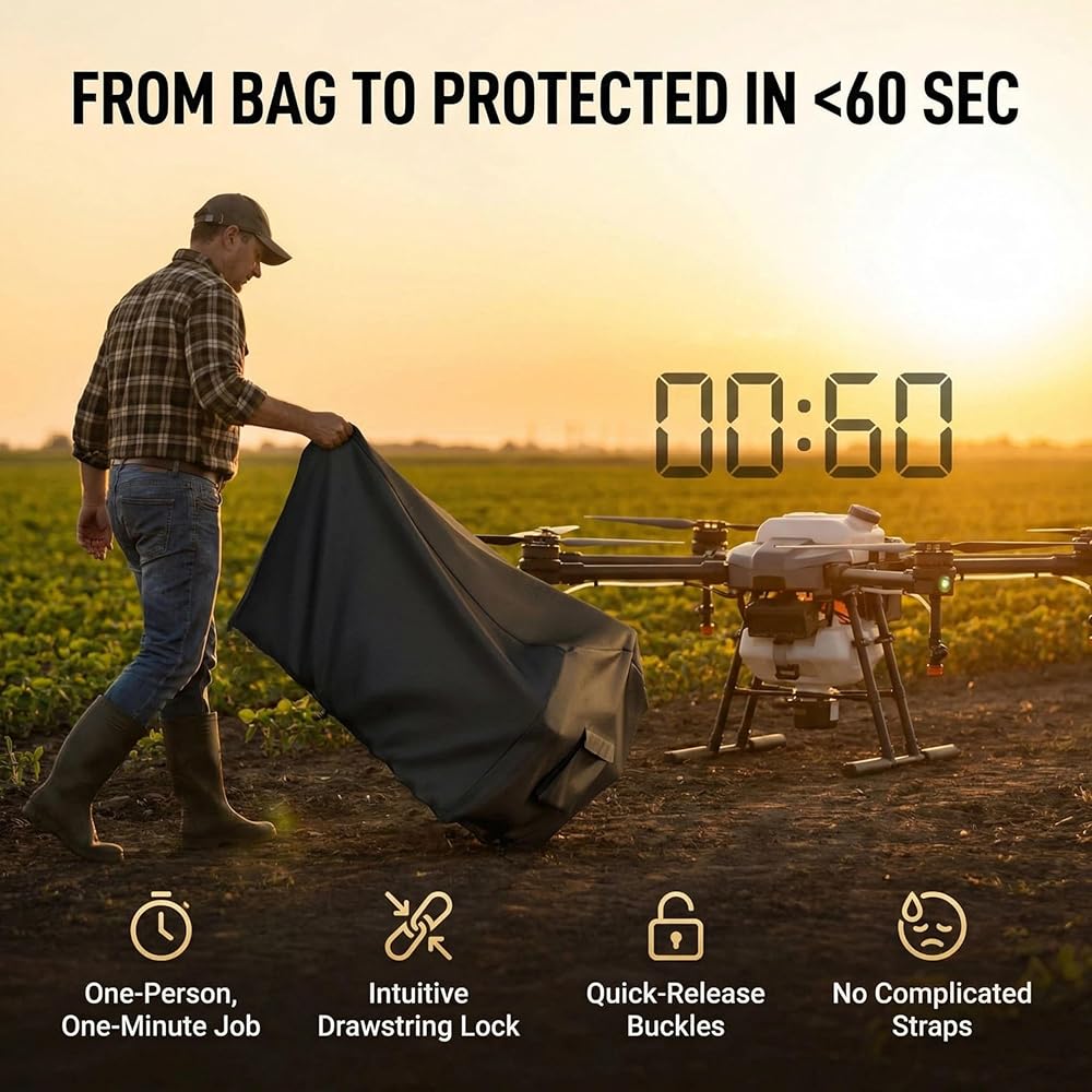 【تصميم متعدد الوظائف】: يتميز غطاء الطائرة بدون طيار الزراعية بتصميم مناسب للشكل مع رباط وإبزيم للتثبيت الآمن ومقاومة الرياح المعززة. توفر الجيوب الجانبية مساحة تخزين مريحة لجهاز التحكم عن بعد والأدوات الخاصة بالطائرة بدون طيار.