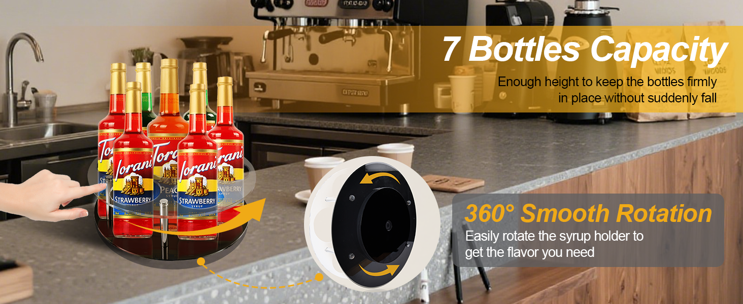 • 【رف شراب 7 زجاجات】منظم شراب القهوة يدور 360 درجة من هاندباناري يحافظ على جميع نكهات الشراب منظمة في مكان واحد لسهولة الوصول إليها. يحمل ما يصل إلى 7 زجاجات بسعة 25.4 أونصة/750 مل من الشراب في وقت واحد، مما يجعل كل نكهة في متناول اليد. مصممة خصيصًا لقضبان القهوة لجعل سطح الطاولة أكثر تنظيمًا