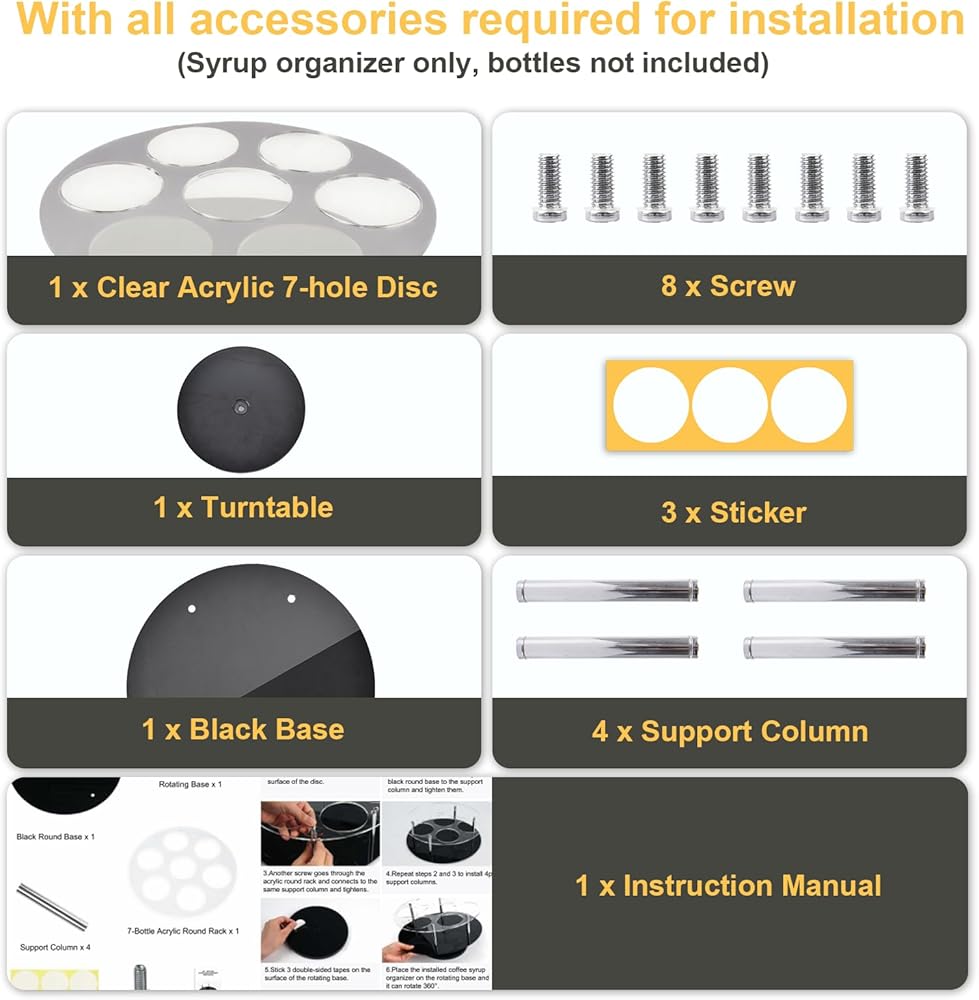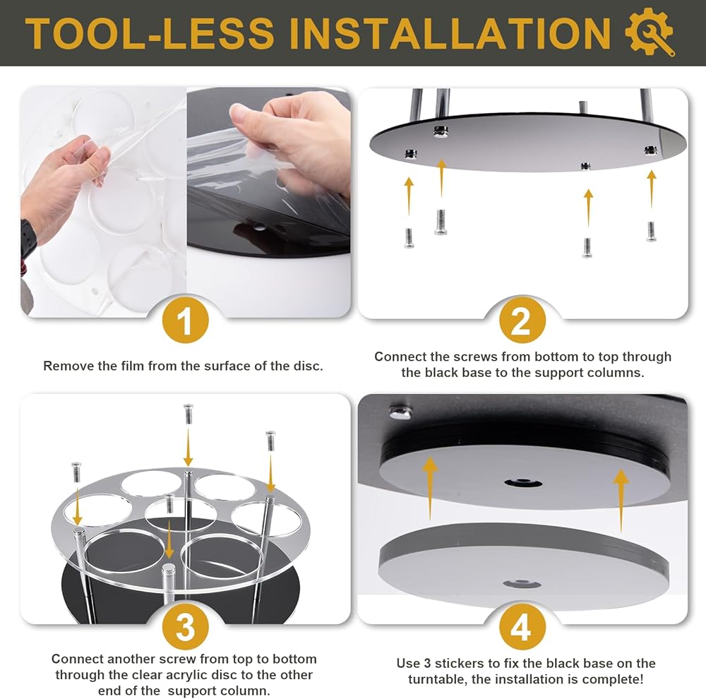 • 【تركيب بدون أدوات】يحتوي الصندوق على جميع الملحقات اللازمة للتركيب، 1 قرص دوار مع 3 ملصقات مرفقة، 1 قاعدة مستديرة سوداء، قرص أكريليك 7 فتحات، 4 أعمدة دعم من الفولاذ المقاوم للصدأ، 8 براغي مع حلقات مطاطية ودليل واحد. لا حاجة لأي أدوات إضافية، ما عليك سوى إزالة الملصقات الثلاثة الموجودة على القرص الدوار للصق القاعدة على القرص الدوار بإحكام، مما يحافظ على ثبات الزجاجة عند الدوران أو الضغط على رأس المضخة.