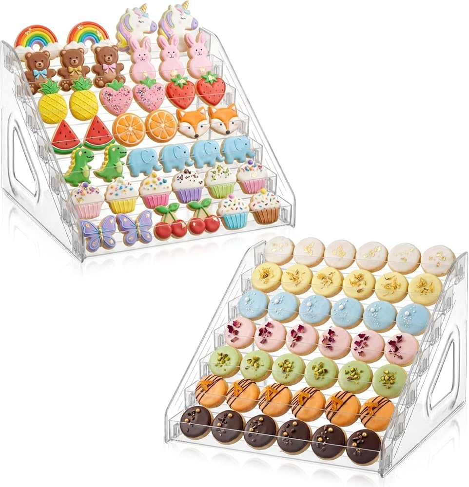 Versatile Display Stand Organizer: You will get 2 pack 7-tier acrylic clear cookie display stand offers an elegant way to showcase your cookies, cupcakes, donuts, muffins, breads and pastries, spices, figures, trading cards and acrylic sticker. This multi-functional display rack is also ideal for bakeries, allowing customers to easily see what they're looking for and effectively boosting sales at farmers' markets, craft fairs, and bakeries. It keeps things neat and organized