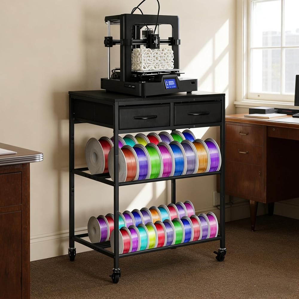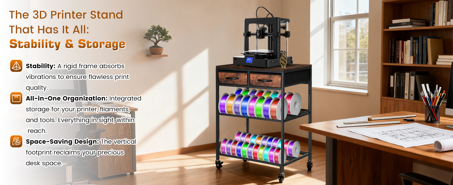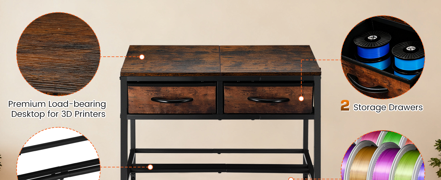 【حامل طابعة ثلاثي الأبعاد متعدد الوظائف】مصمم للتنظيم النهائي. يتميز بسطح مكتب واسع لحمل الطابعة ثلاثية الأبعاد بشكل آمن؛ طبقتان قابلتان للتعديل تسمحان بالتخصيص المرن بناءً على حجم الفتيل؛ 2 درج من القماش يضيف الراحة لتخزين الأجزاء الصغيرة. إنشاء مساحة عمل مرتبة وفعالة!