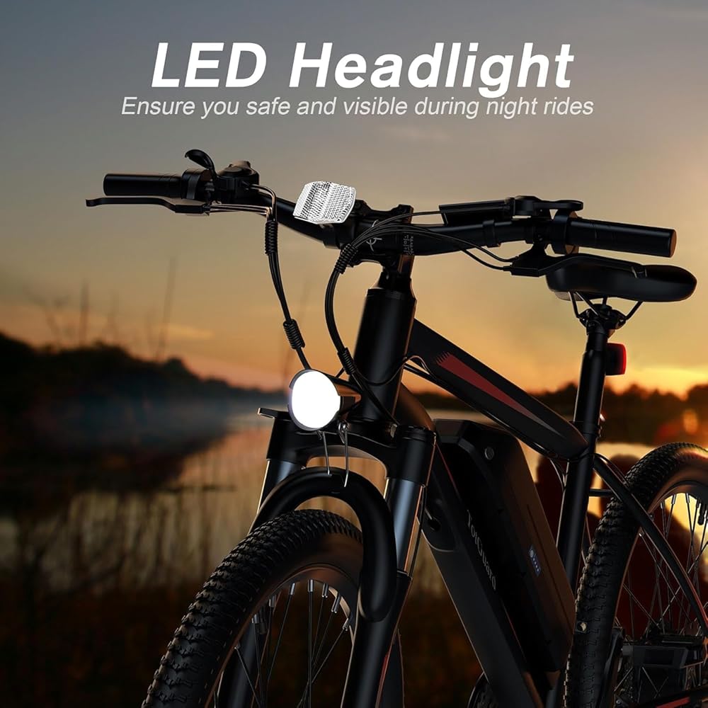 Reliable Electric Mountain Bike: The electric bike for adults is made of high-quality aluminum alloy, sturdy and durable. With professional 21-speed gears, you can adjust the speed to suit any terrain. Lockable front shock fork helps cushion bumps and bring you more comfort when riding on uneven terrain, and the LED headlight makes you visible and safe at night