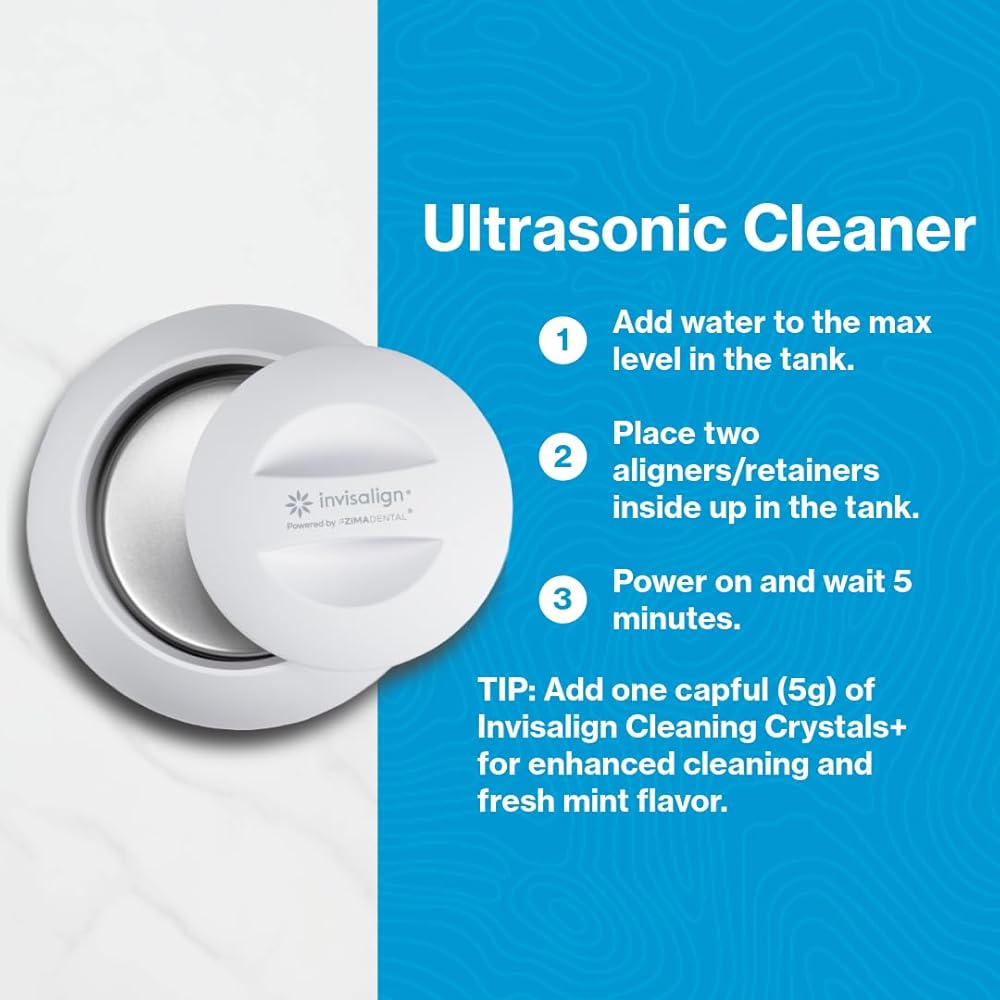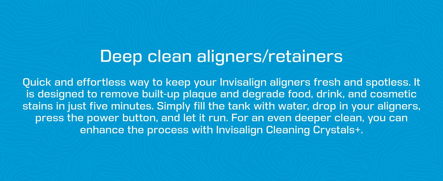 - منظف المصحح والمثبت: حافظ على مصففاتك أو المثبت الخاص بك خاليًا من الروائح، وصحيًا، ونظيفًا باستخدام مصفف Invisalign والمثبت بالموجات فوق الصوتية.