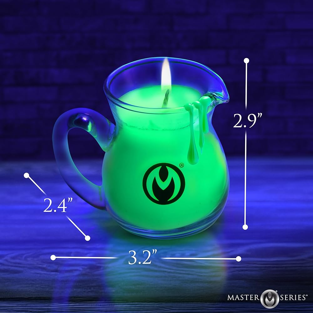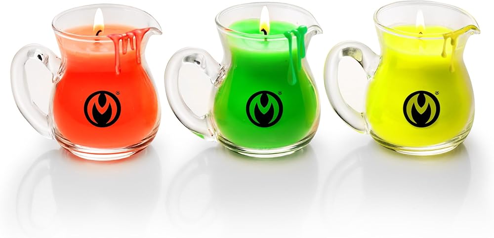Elevate your bdsm and bondage play with this set of Blacklight Wax Play Pitchers, crafted for safe, sexy, and visually stunning temperature play. These UV-reactive candles glow in vivid neon red, green, and yellow under blacklight, adding a dramatic flair to any scene. The unscented soy-paraffin blend melts at a low temperature, making it ideal for skin contact while also offering a moisturizing touch. Each soda-lime glass pitcher features a convenient pouring lip for control and precision. Whether you're new to wax play or a seasoned Dom or sub, this set brings intensity, safety, and unforgettable visual effects to your intimate experiences.