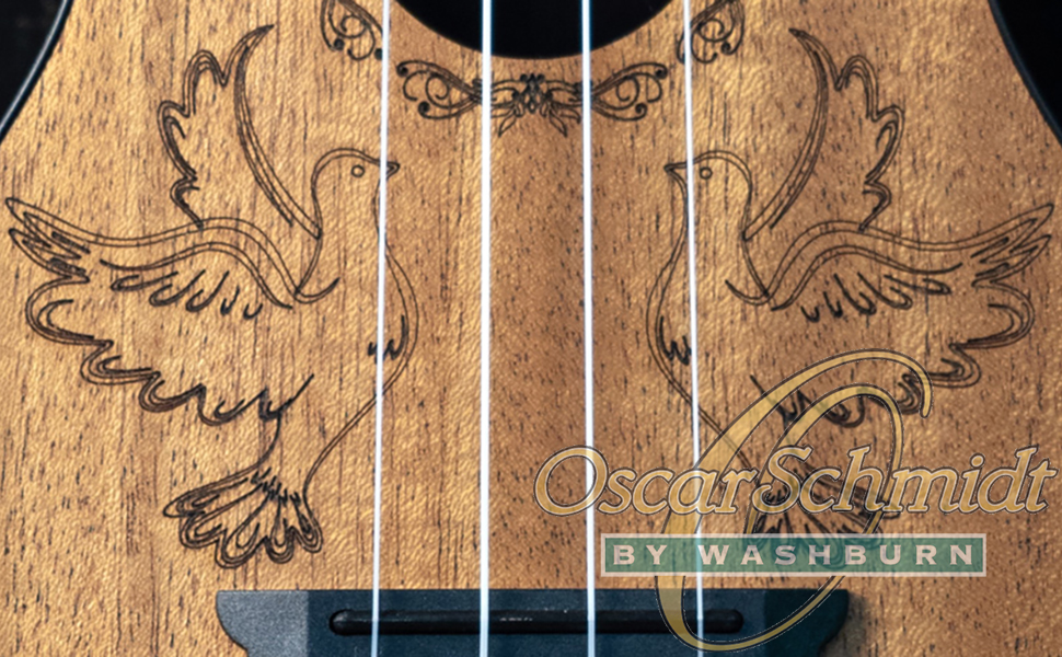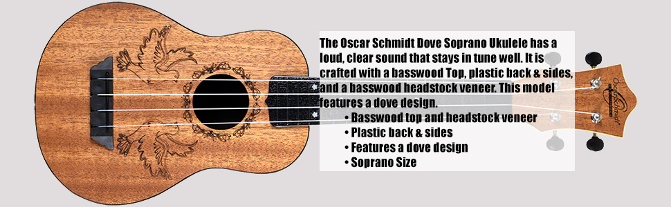 The Oscar Schmidt Butterfly Soprano Ukulele has a loud, clear sound that stays in tune well. It is crafted with a basswood top, plastic back & sides, and a basswood headstock veneer. This model features a butterfly design.