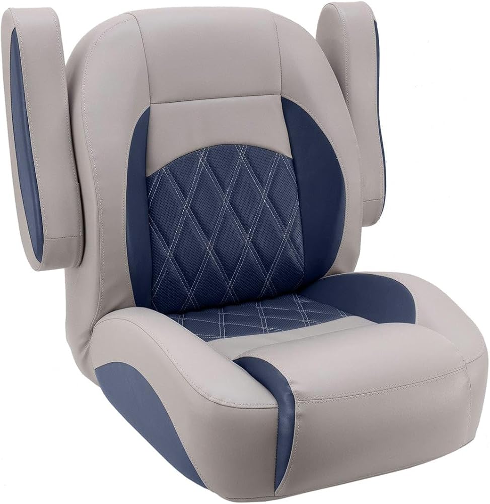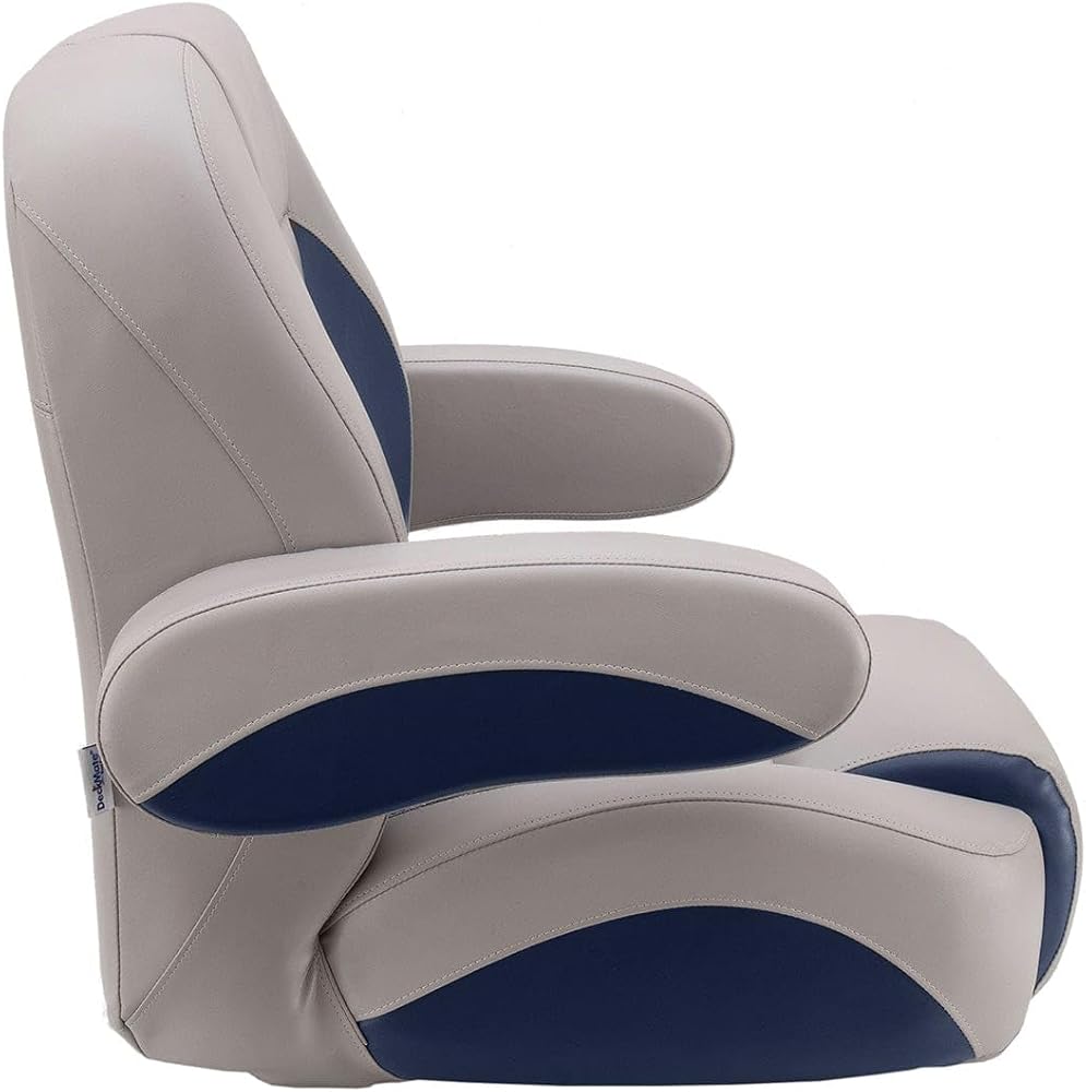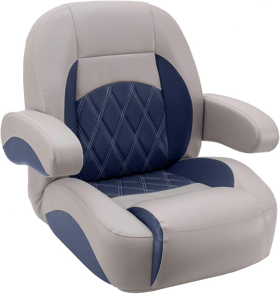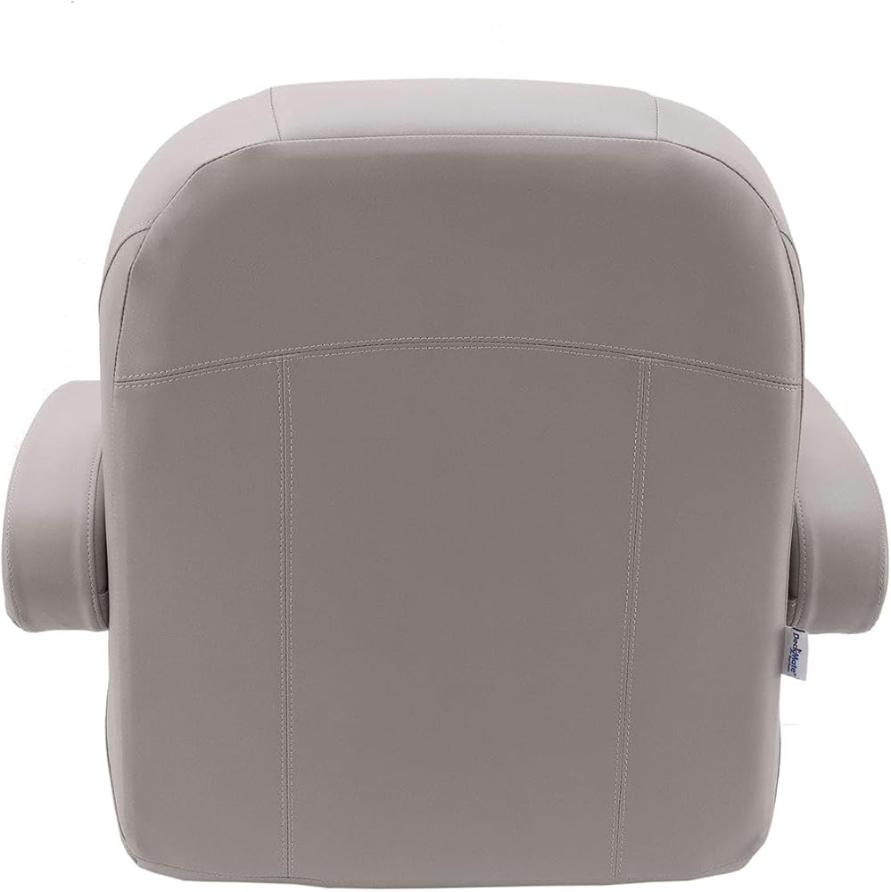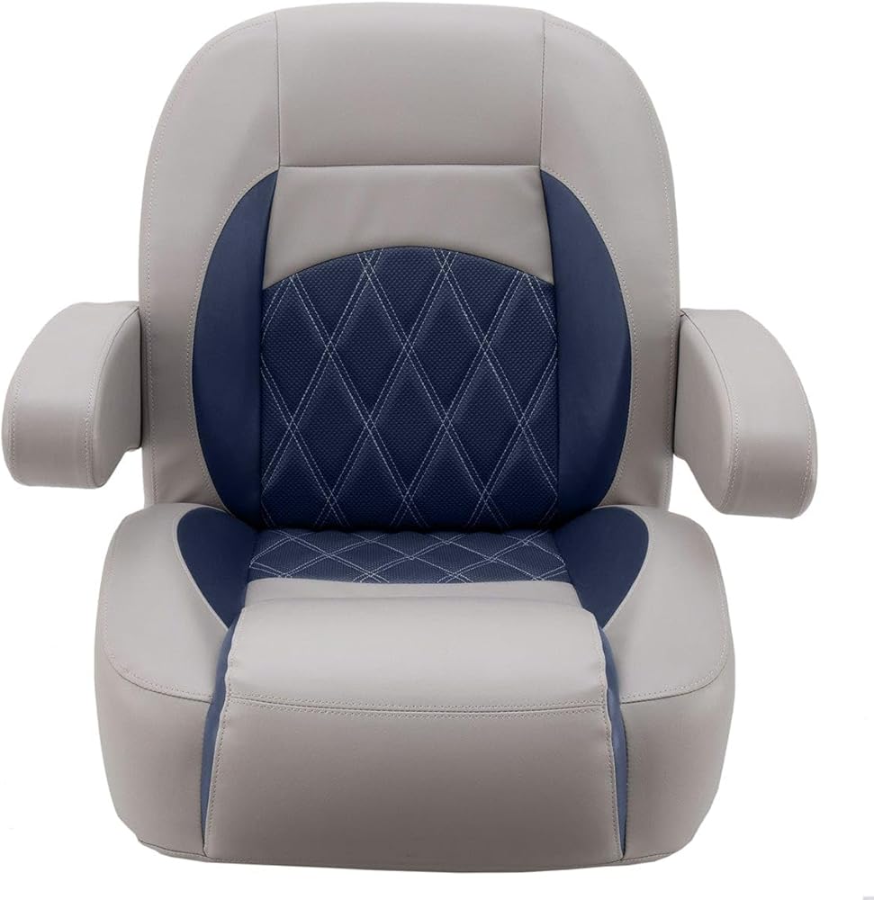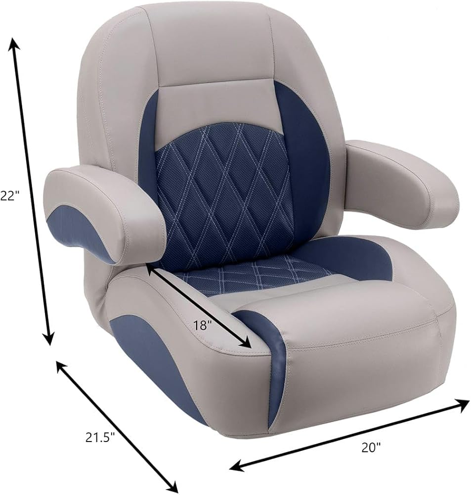 NOTE: Requires a 5 x 12 mounting pattern pedestal. Pedestal not included. Luxury Low Back Pontoon Captain's Chair Our Luxury Pontoon Boat Seats are ergonomically designed with plush molded soft and dense marine foam for long-lasting comfort. We use double-top stitching on all stress points, so you never need to worry about torn seams. Our pontoon boat seats look new longer! We have designed our Luxury line of seats to look like the OEM seats you see on new pontoon boats. Now you can really make that old pontoon look like it came directly off the pontoon factory floor. Our pontoon seats will last! The quality of your vinyl and foam won't matter if your seams tear or rot. That's why we only use the best UV and treated polyester thread. 32 oz marine grade seat vinyl is coated and treated to exceed industry standards for UV resistance. Our pontoon boat seat cushions are built with a mix of soft and dense foam for a plush boating experience. Our Luxury seats are specially designed to ergonomically support your body in the proper ways to make you and your passengers comfortable all day. Seat bases with molded drain channels increase the life of your pontoon flooring by allowing water to escape your deck instead of being trapped and left to soak into your carpet and decking. No wood! All of our pontoon furniture frames are plastic. We use injection-molded plastic seat cushion frames and rotationally molded plastic seat bases. High-grade stainless steel hardware and staples are used on our pontoon seats, along with t-nuts, which are inserted into the plastic bases to secure each pontoon seat cushion. Dimensions: 20" wide 22" tall 21.5" deep Item weight: 31lbs