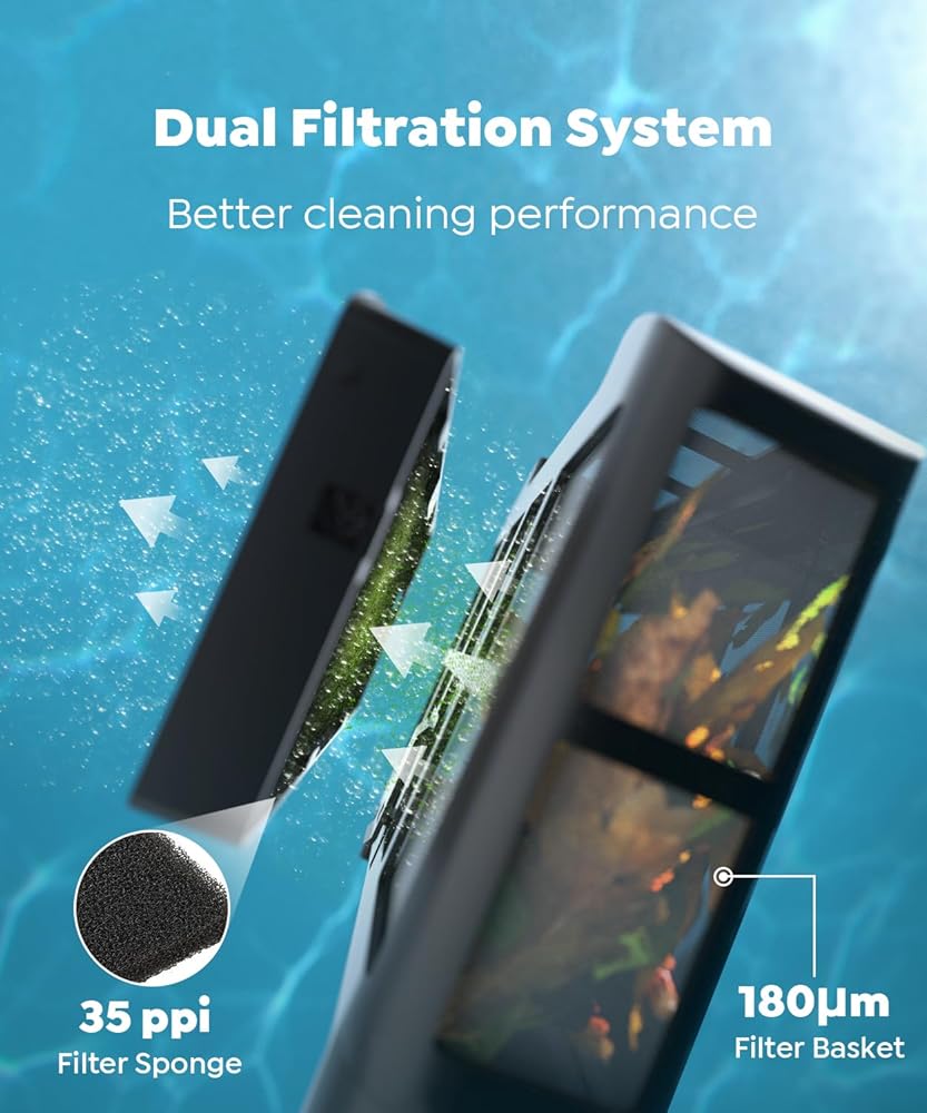 • شفط قوي + ترشيح مزدوج عالي الكفاءة: يتميز C1 بتصميم ثلاثي المحرك للحصول على قوة شفط استثنائية.. مزود بترشيح مزدوج الطبقة (سلة فلتر 180 ميكرومتر للجسيمات الكبيرة + إسفنجة دقيقة للرمل الناعم والغبار)، فهو يزيل كل من الحطام الكبير والجسيمات الدقيقة في وقت واحد، مما يترك مياه حوض السباحة واضحة تمامًا.