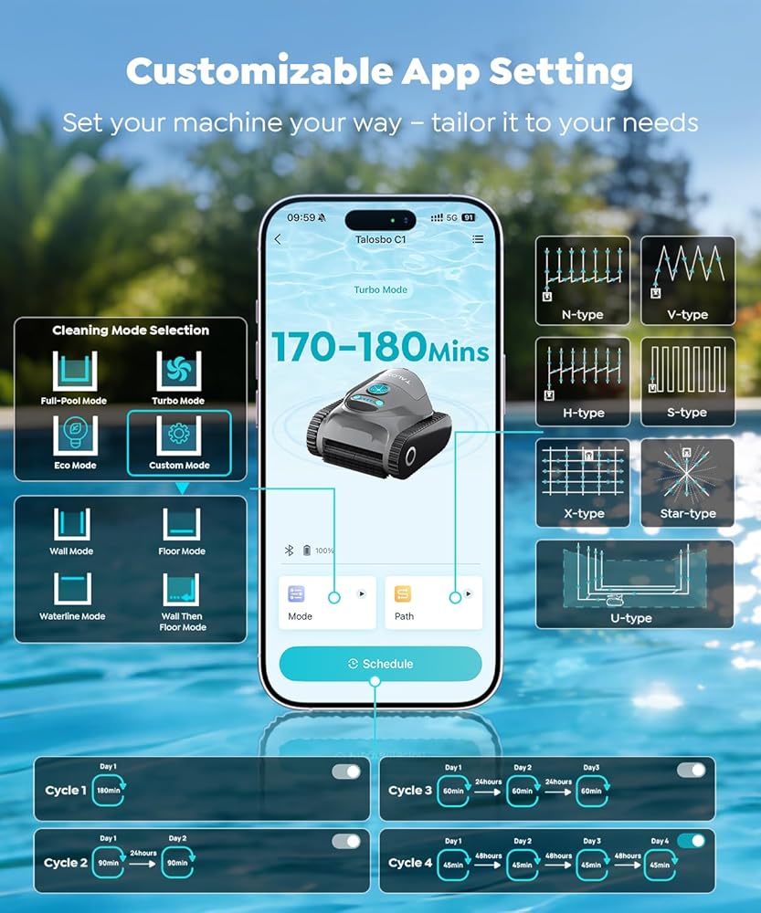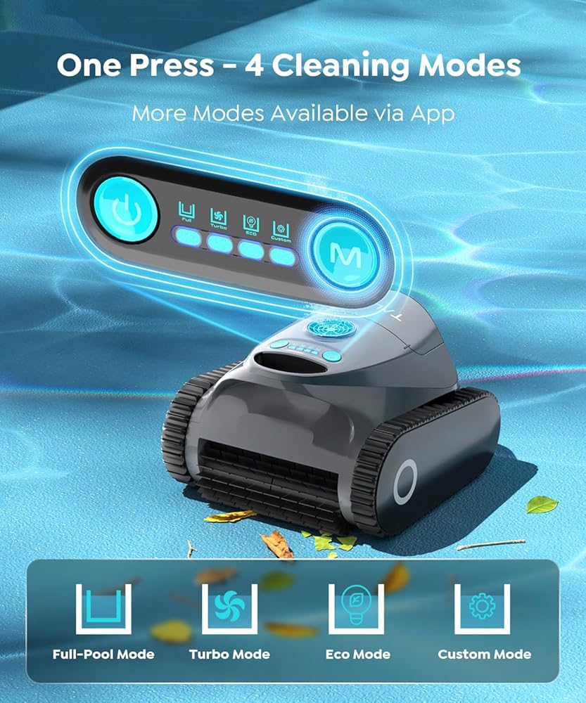 • الملاحة المتقدمة بالذكاء الاصطناعي و7 أوضاع للتنظيف: يدمج منظف حمام السباحة C1 التنقل الذكي بالذكاء الاصطناعي مع 7 أوضاع تنظيف قابلة للتخصيص لتوفير تنظيف دقيق وفعال لأي حمام سباحة: تنظيف كامل لحمام السباحة، وتنظيف الأرضيات فقط، وتنظيف الجدار فقط، وتنظيف خط الماء، وتنظيف الجدران والأرضيات، والتنظيف المكثف للأرضيات، والوضع البيئي. يقوم نظام الذكاء الاصطناعي الذكي بتخطيط الطرق المثلى ويتكيف مع الوضع الذي اخترته للحصول على تغطية كاملة ونتائج تنظيف فائقة. ملاحظة: اضبطه قبل دخول الماء.