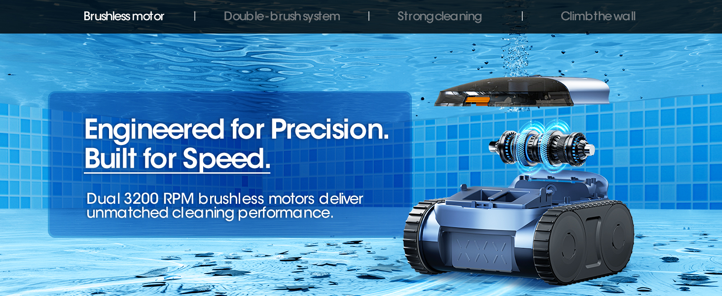 محركات مزدوجة بدون فرش بقدرة 180 وات وقوة قوية: يعمل منظف حمام السباحة بمحركين بدون فرش بقدرة 180 وات يمكن التحكم فيهما بشكل مستقل، ويوفر شفطًا قويًا ومتسقًا لإزالة كل شيء بدءًا من الحطام الناعم إلى الأوراق الثقيلة. يضمن النظام الداخلي الحاصل على تصنيف IP68 التشغيل الهادئ وعمر الخدمة الطويل والأداء الموثوق.