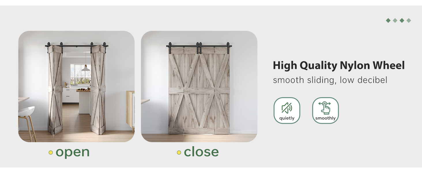 سهلة التركيب: العرض الإجمالي للوحة الباب بالإضافة إلى 4 بوصات هو طول المسار. نحن نقدم تعليمات مفصلة لمجموعة أبواب الحظيرة المنزلقة ثنائية الطي مع الصور والنصوص، والتي يمكن تركيبها بشكل بديهي بنفسك، مما يوفر الوقت والتكلفة في العثور على فريق تركيب لك.