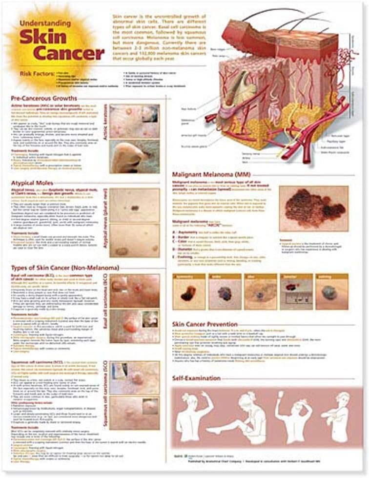 Understanding Skin Cancer Anatomical Chart, Second Edition defines skin cancer and provides detailed illustrations of how it develops from sun exposure. The chart shows and discusses various types of ultraviolet radiation and how each kind penetrates the skin layers. It illustrates and shows photos of various types of precancer and cancer, lists the ABCD's of malignant melanoma, and provides a graph which indicates the incidence of melanoma is rising rapidly. The chart shows how skin naturally works to prevent skin cancer, illustrates the difference between sunscreen and sunblock, and offers advice on self-examination, how to avoid the sun, and more.