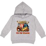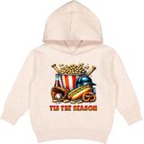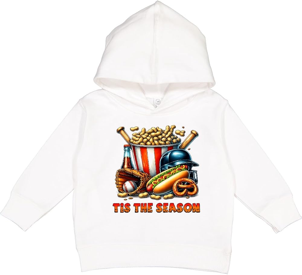 Get ready for the game with this vibrant 'Tis The Season' illustration featuring classic baseball snacks and gear. Perfect for fans and players alike, celebrate your love for baseball with every wear of this Toddler Hoodie.