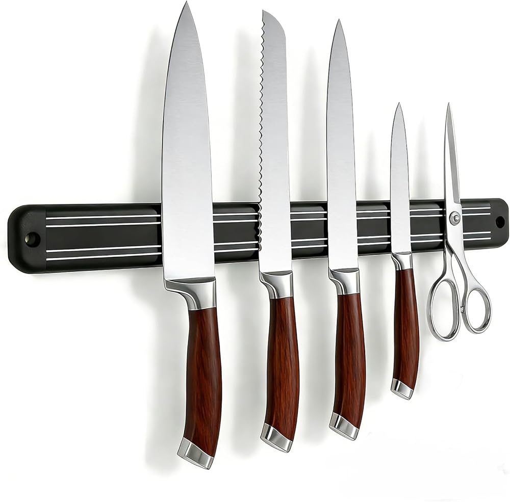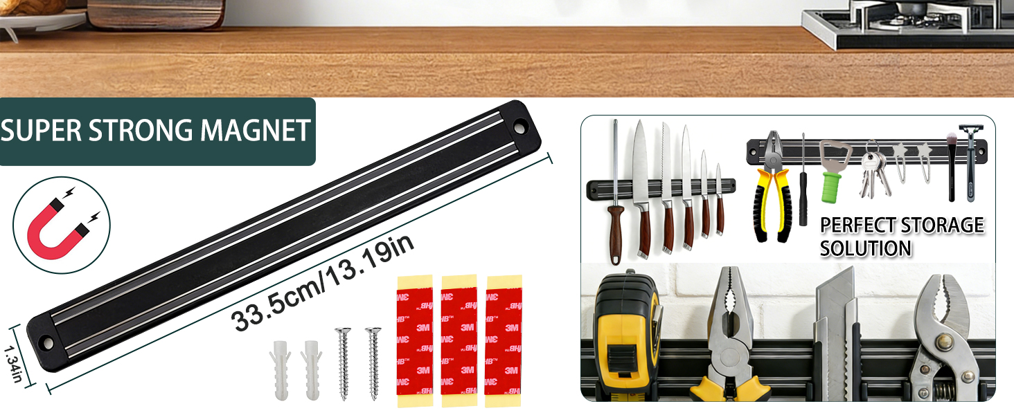 13 بوصة/33.5 سم: يبلغ طول الشريط المغناطيسي الخاص بنا 13 بوصة والذي يمكنه حمل سكاكين مختلفة، بينما لا يزال صغيرًا بما يكفي ليناسب العديد من الزوايا والرافعات في جدران مطبخك.