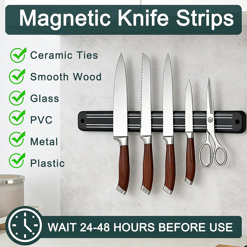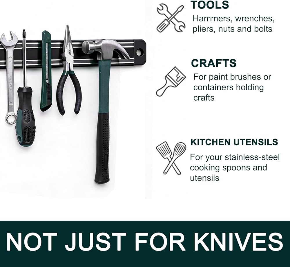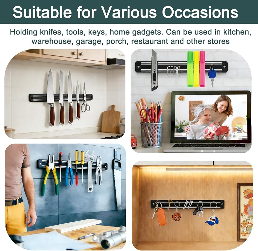 شريط سكاكين مغناطيسي متعدد الوظائف: يمكن لحامل السكاكين المغناطيسي الخاص بنا توفير مساحة قيمة وجعل المطبخ يبدو مرتبًا، مما يوفر وصولاً أكثر ملاءمة لسكاكينك أو أدواتك. يمكن استخدامه كحامل أدوات المطبخ، ومنظم منزلي، ومنظم مستلزمات فنية. إنه حامل أدوات مغناطيسي مثالي للمطبخ وغرف المرافق وغرف الغسيل والجراجات والمناطق الأخرى لحمل السكاكين والمقص وألعاب الأطفال وتنظيم الأدوات والألعاب الصغيرة والمفاتيح.