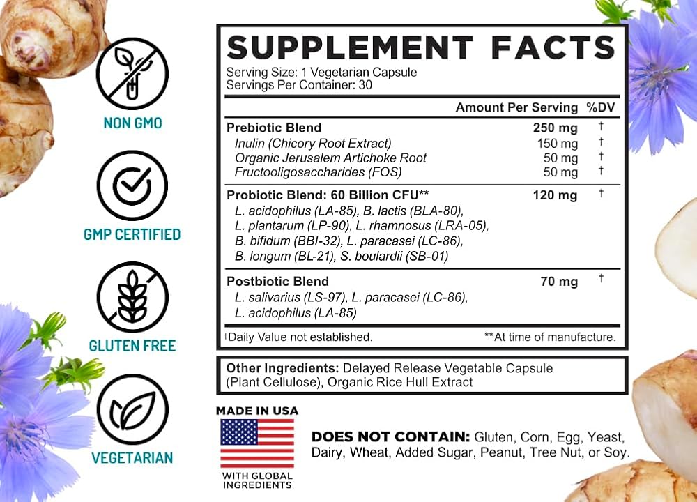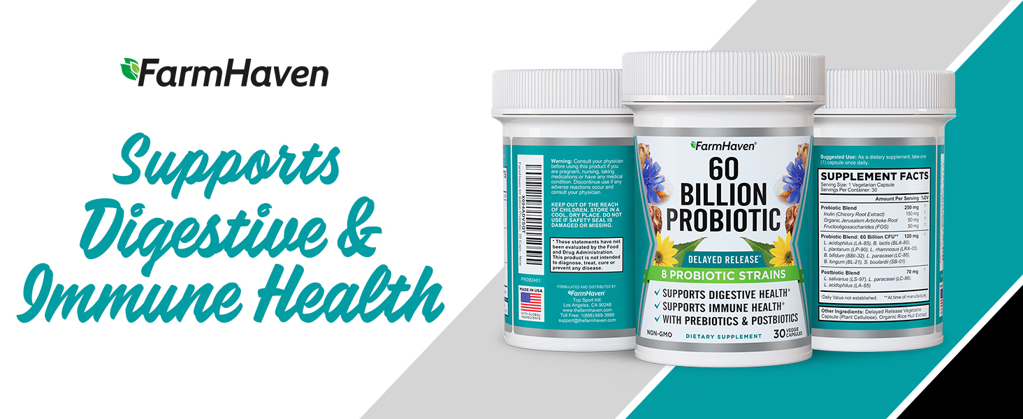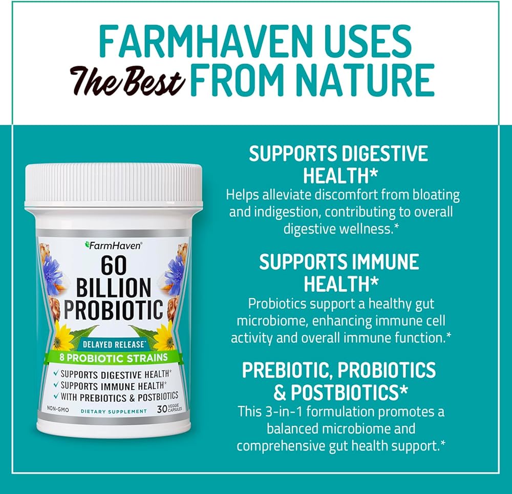 بوستبيوتيك لتعزيز المناعة: بوستبيوتيك هي مركبات مفيدة تنتجها الكائنات الحية الدقيقة في الأمعاء أثناء نموها. يحتوي 60 مليار بروبيوتيك من FarmHaven على L. Salivarius وL. Paracasei، وهي مواد ما بعد الحيوية معروفة بأنها تساعد في دعم جهاز المناعة من خلال تنظيم الاستجابات المناعية واستجابة الجسم للالتهابات. *