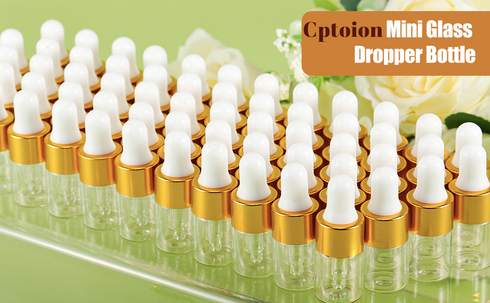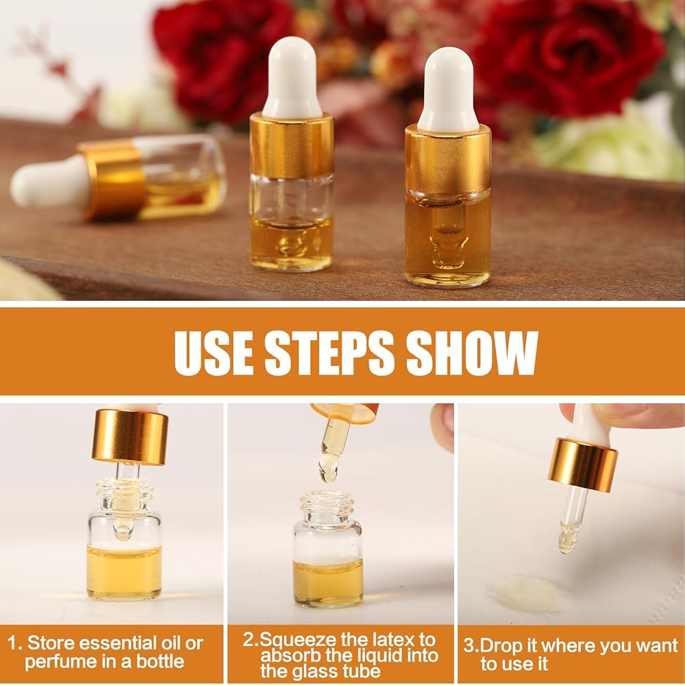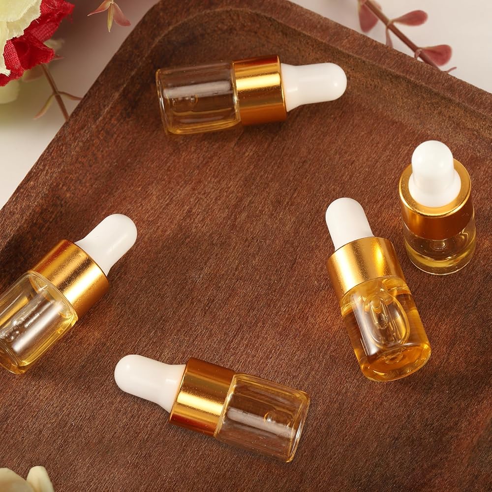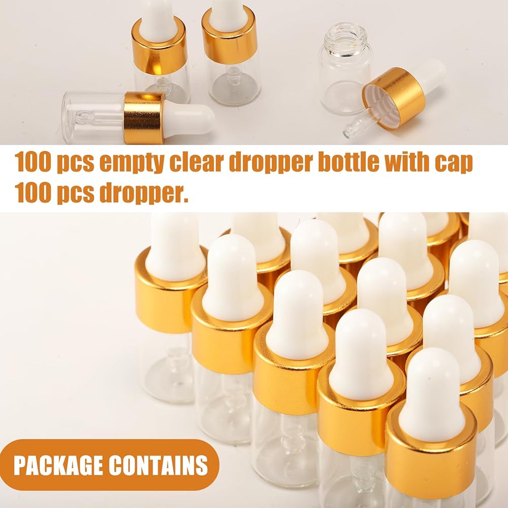 100 عبوة من زجاجات قطارة زجاجية صغيرة سعة 2 مل مع أغطية ذهبية، وقوارير زيت عطري صغيرة، وحاويات عينات سفر فارغة للسوائل والعطور والصبغات ومستحضرات التجميل