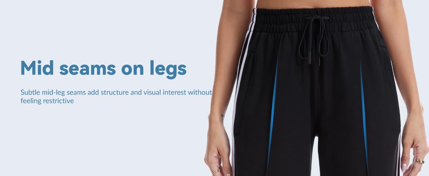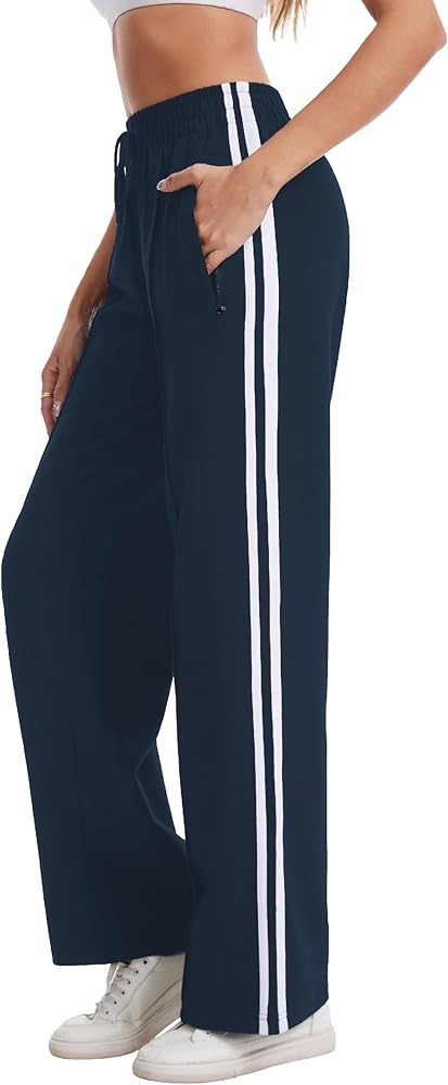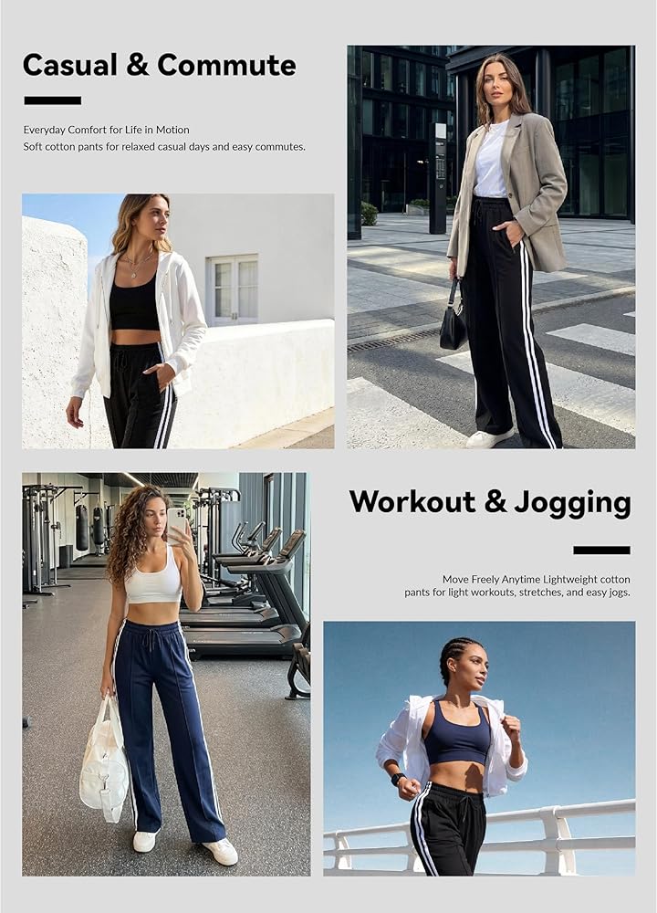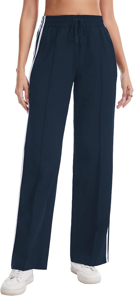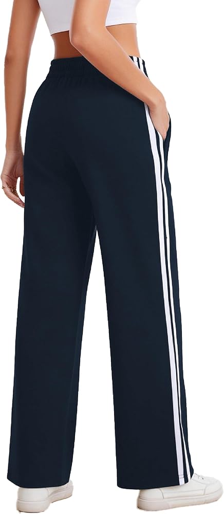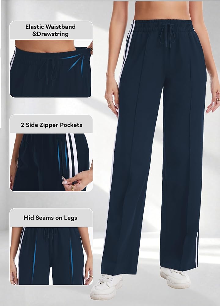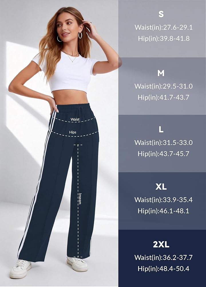 أرجل واسعة وأشرطة جانبية: تم تصميم هذه السراويل الرياضية النسائية بتصميم مريح واسع الساق، وتتميز بخطوط نظيفة وخطين جانبيين أبيضين متباينين يضيفان لمسة رياضية مع الحفاظ على مظهر كاجوال وجذاب للارتداء اليومي والتمارين الخفيفة.