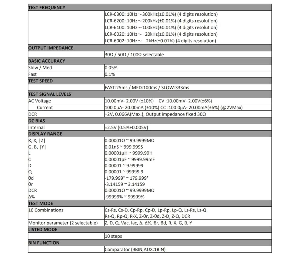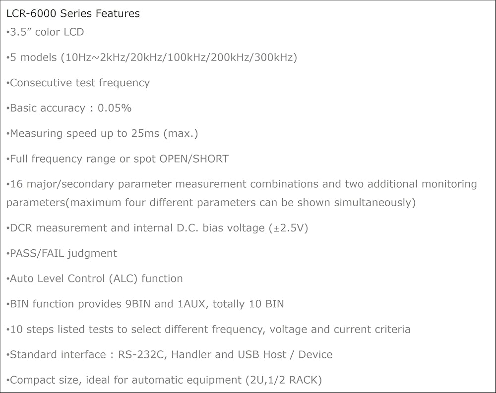 5 models (10Hz~2kHz/20kHz/100kHz/200kHz/300kHz), measurement speed up to 25ms (max)