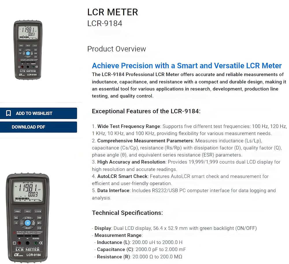 Full measurement parameters: Inductance (Ls/Lp), Capacitance (Cs/Cp), Resistance (Rs/Rp)