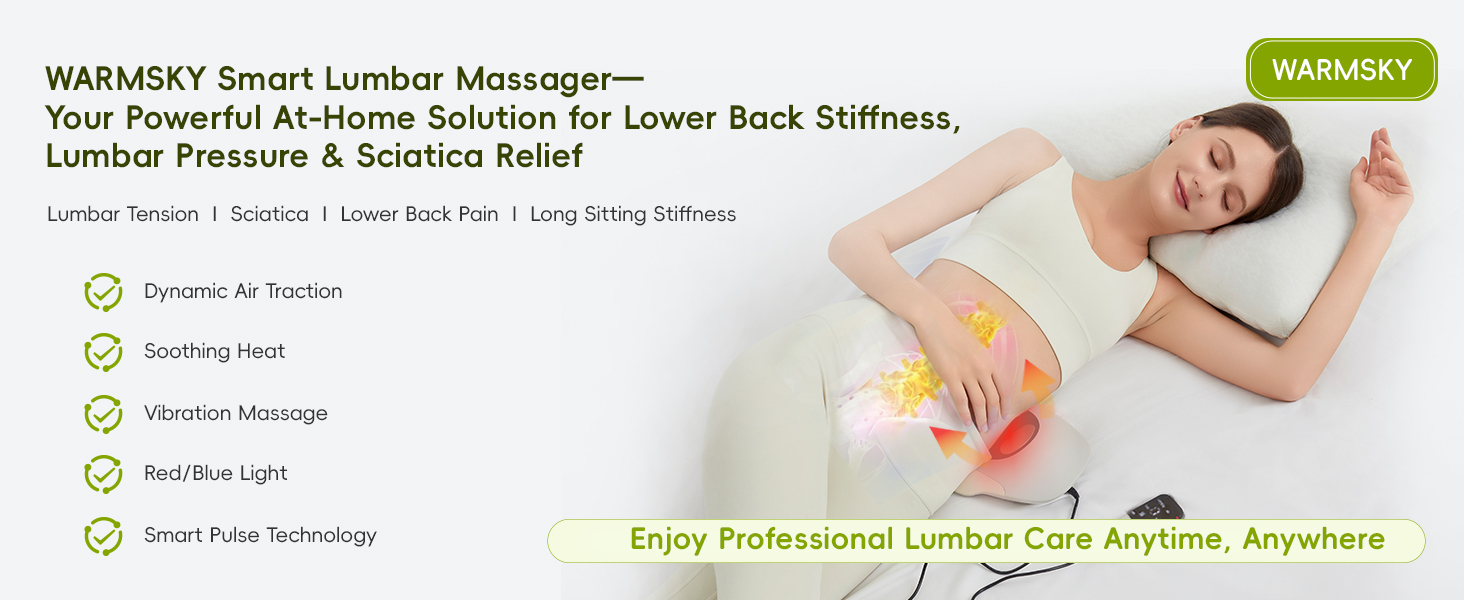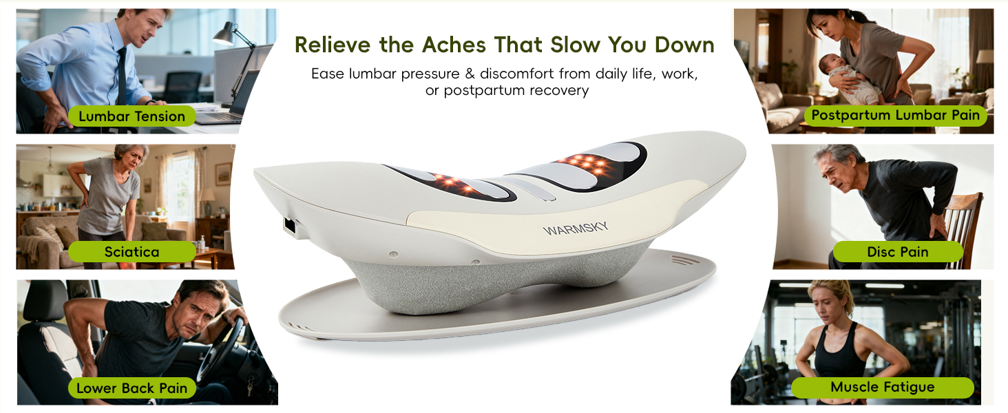الحرارة + الاهتزاز + النبض الذكي مع الضوء الأحمر/الأزرق للتخفيف العميق - استهدف آلام أسفل الظهر وعدم الراحة في عرق النسا من خلال تضافر الحرارة المهدئة والاهتزاز الإيقاعي وتكنولوجيا النبض. يعمل الضوء الأحمر والأزرق على استرخاء عضلات أسفل الظهر، وتعزيز تعافي الأعصاب، وتحسين الدورة الدموية - مما يخفف الألم الناتج عن الانزلاق الغضروفي، وعرق النسا، والإجهاد القطني.