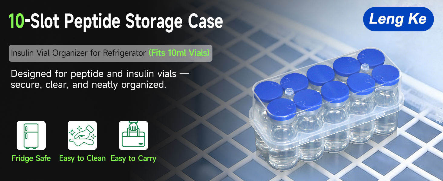 【شفافة في لمحة】تتميز حافظة الببتيد هذه للثلاجة بتصميم شفاف، وتسمح لك هذه الحافظة بالتحقق على الفور من ملصقات القارورة وتواريخ انتهاء الصلاحية دون فتحها أو إزالة الزجاجات. علبة ببتيد 10 مل تساعد الرؤية الواضحة على منع الأخطاء وتبسيط إدارة الأنسولين أو الببتيدات.