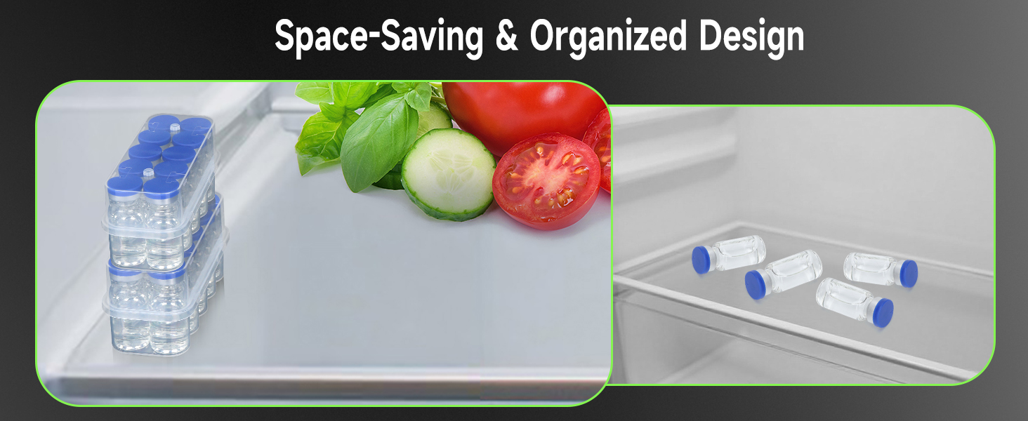 【قابلة للتكديس وموفرة للمساحة】تم تصميم علبة الببتيد هذه للثلاجة بهيكل آمن ومتشابك، وهي صغيرة الحجم وقابلة للتكديس. يمكن وضعها بسهولة في أي رف أو درج ثلاجة، ثم قم بتكديس حافظات متعددة عموديًا لبناء نظام تخزين ثابت وموفر للمساحة. مثالية لزيادة مساحة الثلاجة المحدودة مع الحفاظ على جميع قواريرك في وضع مستقيم ومنظمة ويمكن الوصول إليها على الفور.
