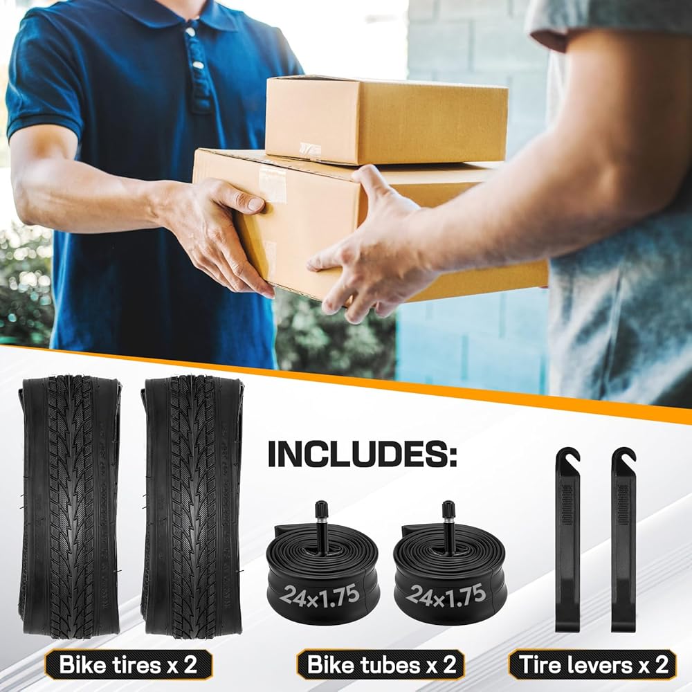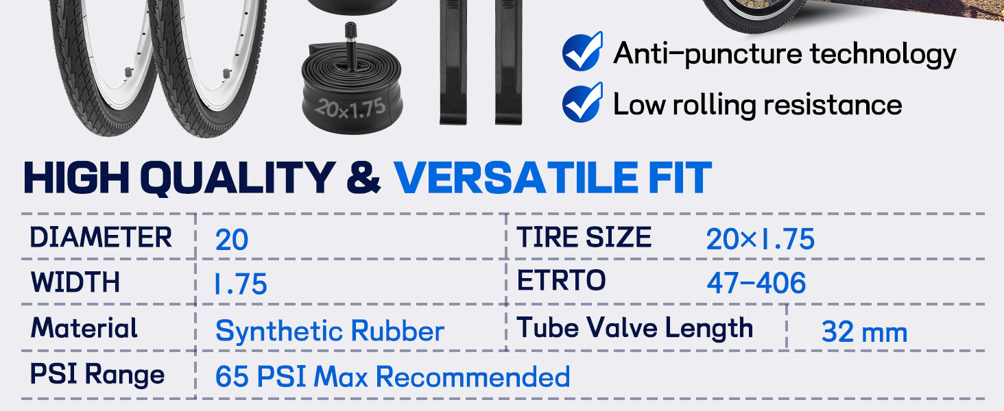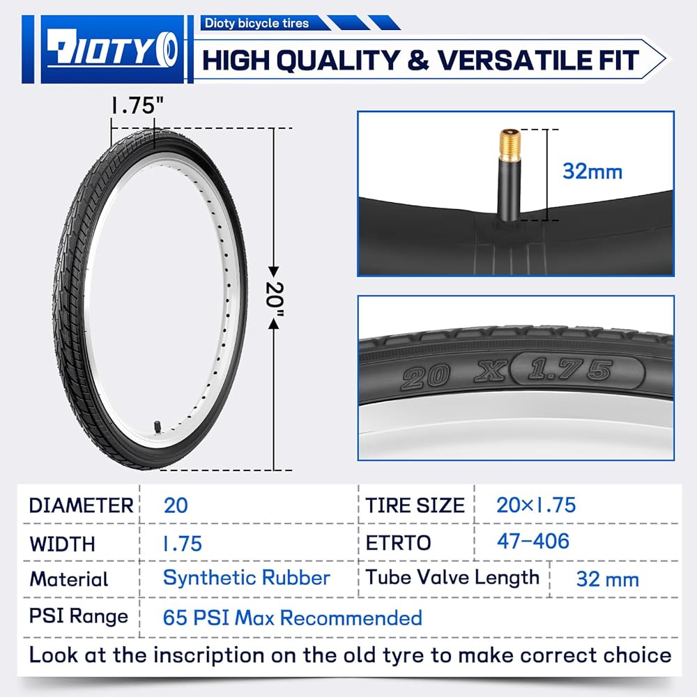 تتضمن العبوة: إطارات دراجة 2 × 20 × 1.75 بوصة، 2 × أنابيب داخلية للدراجة، 2 × رافعة للإطارات. تم تصميم مجموعة إطارات الدراجة مقاس 20 بوصة لمجموعة واسعة من الدراجات مقاس 20 بوصة. إطار دراجة مقاس 20 × 1.75 يناسب تمامًا الأحجام القياسية مثل 20 × 1.75 و20 × 1.95 و20 × 2.0، مما يجعلها بديلاً مثاليًا لإطارات الدراجة.
